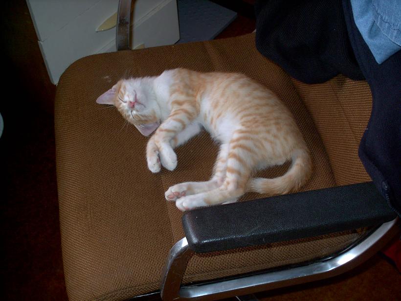 Začali jsme bojovat o život. Dostal najíst, napít , pelíšek a černý kocour TIM, jej vzal za vlastního. První hovínka byla hromádka vlasových nudlí, takže odčervení od škrkavek. Den po dni se vzpamatovával a vyrůstal z něho nádherný kocourek. Od svého velkého kamaráda se učil, stále za ním chodil jak stín.
