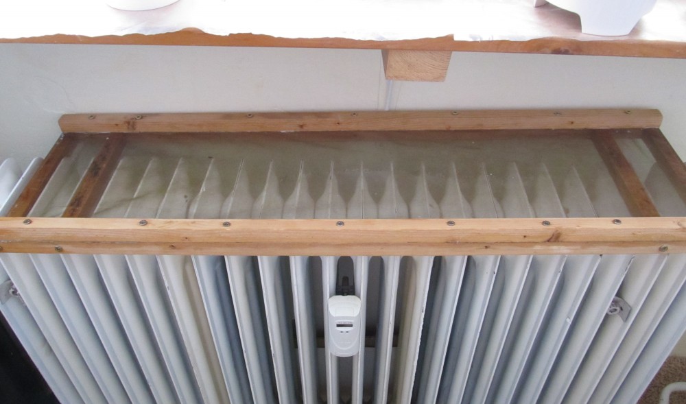 Pro sušení využíváme tepla topícího radiátoru. Manžel vyrobil takový rámeček potažený silonem, který pasuje na náš radiátor.