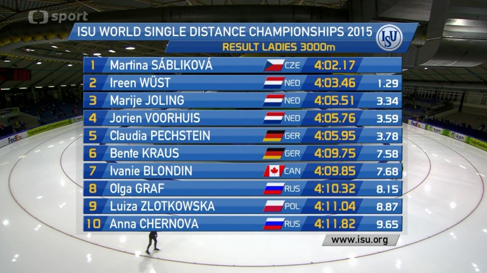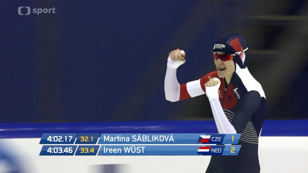 Po vítězství na letošním mistrovství světa v nizozemském Heerenveenu v závodě na 3000 metrů žen Martina Sáblíková získala zlatou medaili i v pátek 13.února i na 5000 metrů. Je to trať, na které vyhrála i na loňských olympijských hrách v Soči. Na 3000 m prohrála Martina v Soči 2014 právě s holandskou soupeřkou Ireen Wüstovou, kterou ale ve čtvrtek 12.února porazila na domácím ledě.