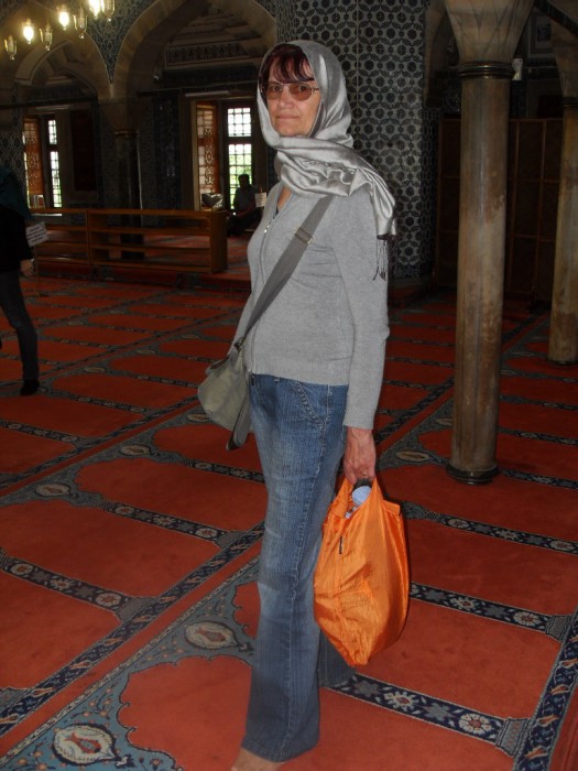 Chceme vejít do mešity. Není to zcela jednoduché. Je nutné se zout a boty uložit do regálu či připravené igelitové tašky. Ten, kdo má kalhoty nebo sukni nad kolena, půjčuje si dlouhou zavinovací sukni. Ženy dávají na hlavu svůj nebo půjčený šátek. Hotovo. Jsme připraveni, můžeme dovnitř. Mešita je opravdu krásná. Stejně jako všechny ostatní. Je nač se dívat. Na kobercích klečí lidé - většinou muži a modlí se. Ženy a muži se musí modlit zvlášť. Důvod je jasný. Klečící či v kleku ležící žena před mužem by ho při pohledu na její pozadí odváděla od myšlenek na modlitbu. Zajímavé zdůvodnění.