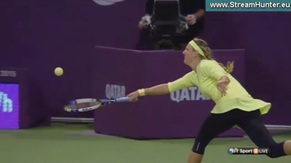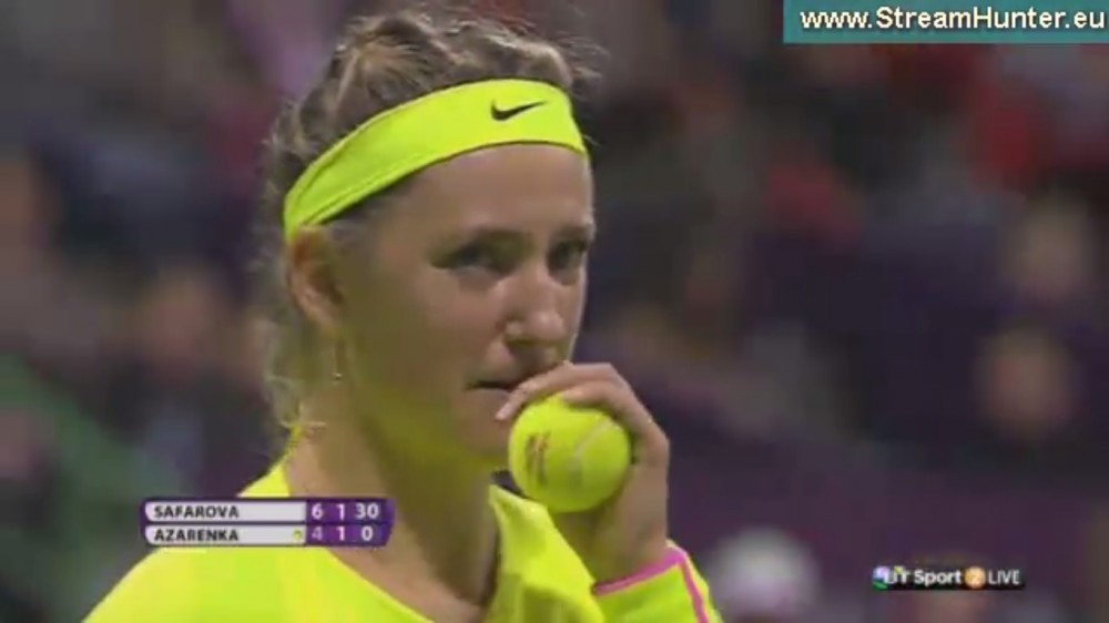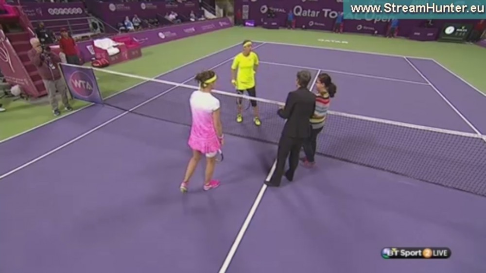 Po zahrání katarské hymny nastupují obě hráčky, usměvavá Lucie Šafářová ve slušivém bílo - růžovém úboru, osmadvacetiletá rodačka z Brna a pětadvacetiletá Viktoria Azarenková z Běloruska ve žlutém a černých legínech pod koleno, ("hučící siréna", mezi tenistkami). Lucie bude hrát o svůj první triumf v této sezóně.