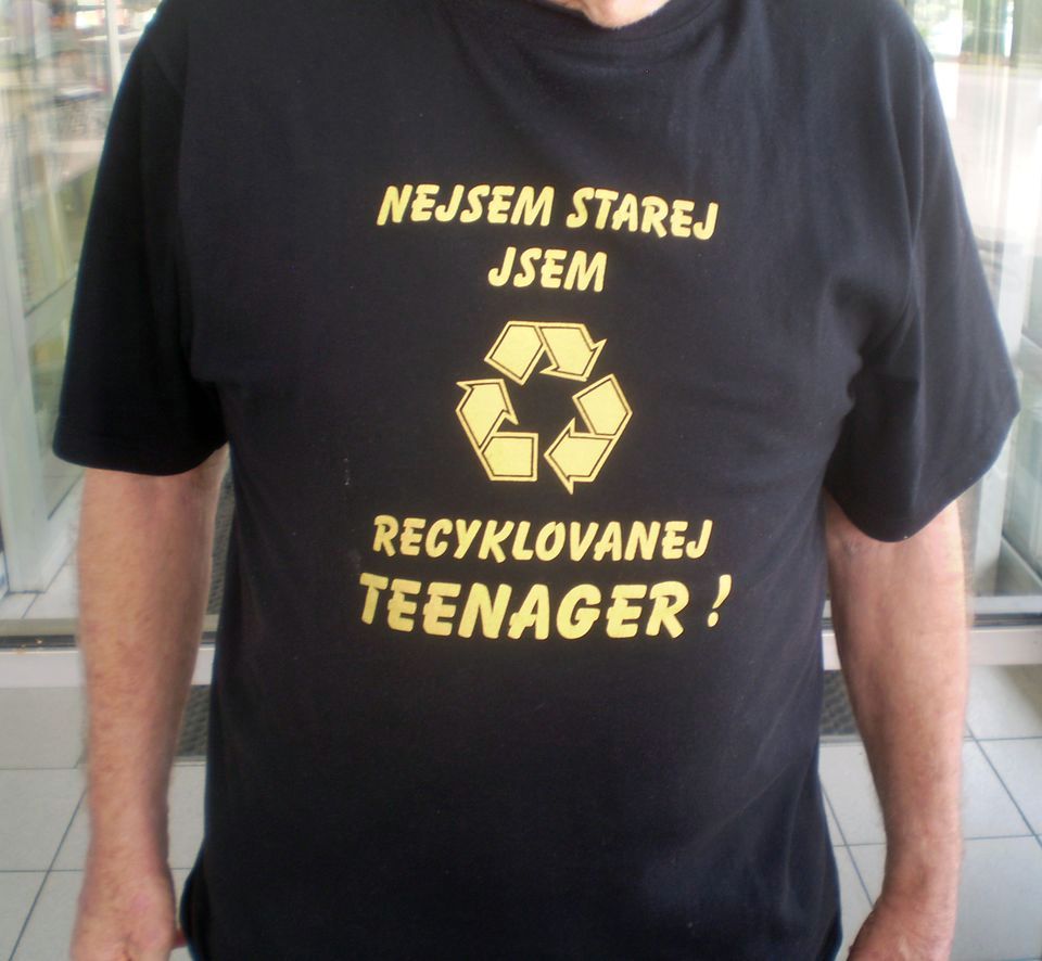 17. Nápis na tričku : Nejsem starej - jsem jen recyklovanej teenager.