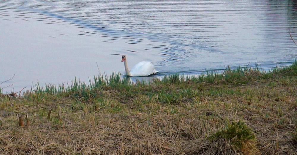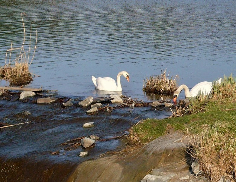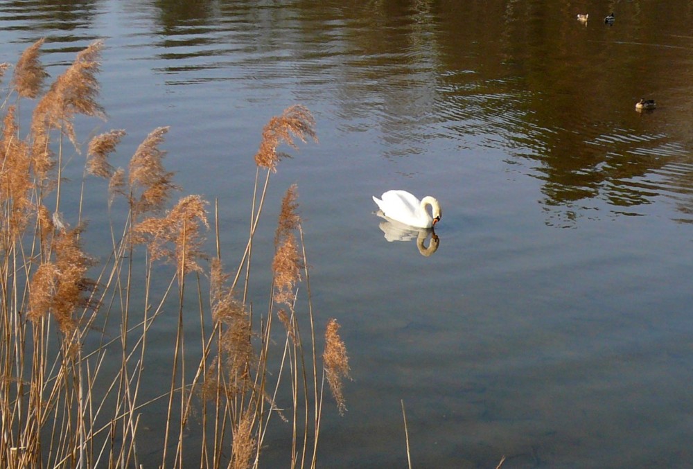 Letos se tu zatím vyskytuje jen jeden pár labutí velkých a vypadá to, že již zahnízdil. Ještě o svátcích společně přelétali sem a tam z jezera do zátoky nebo společně hledali v mělké vodě potravu. Dnes se kolem mostu v době mé přítomnosti vznosně plavila jen labuť a co chvíli nořila svůj štíhlý krk do vody, aby se nasytila. Druhého z páru jsem objevila v rákosí na konci zátoky - asi již na hnízdě zahříval snůšku, protože se za celou tu dobu nepohnul z místa.