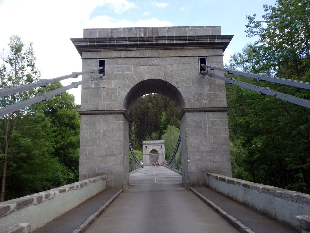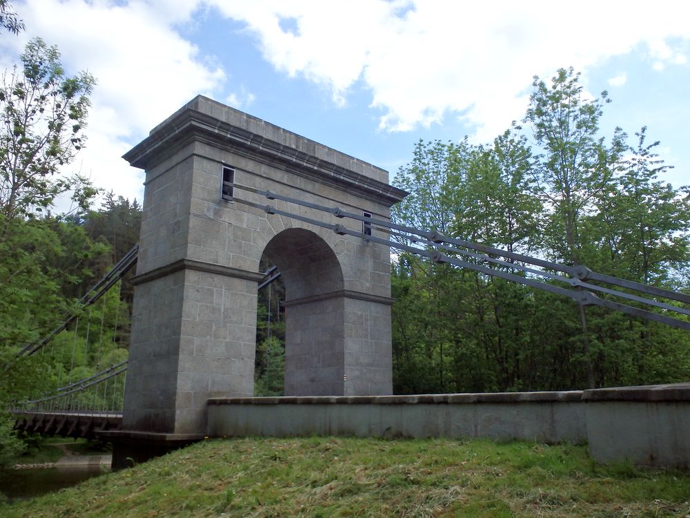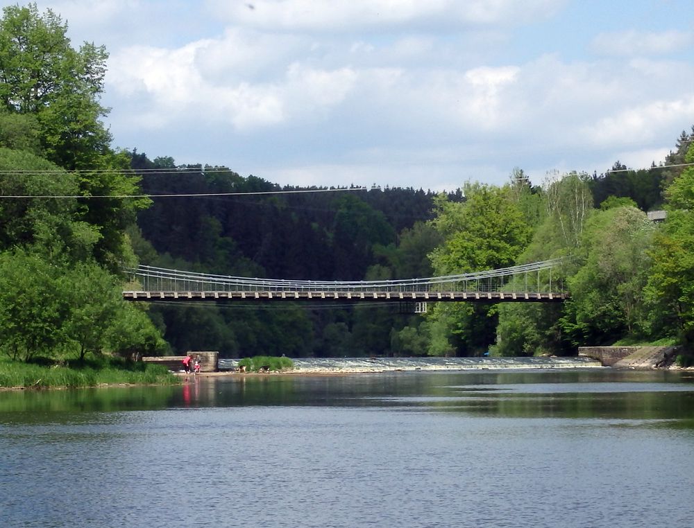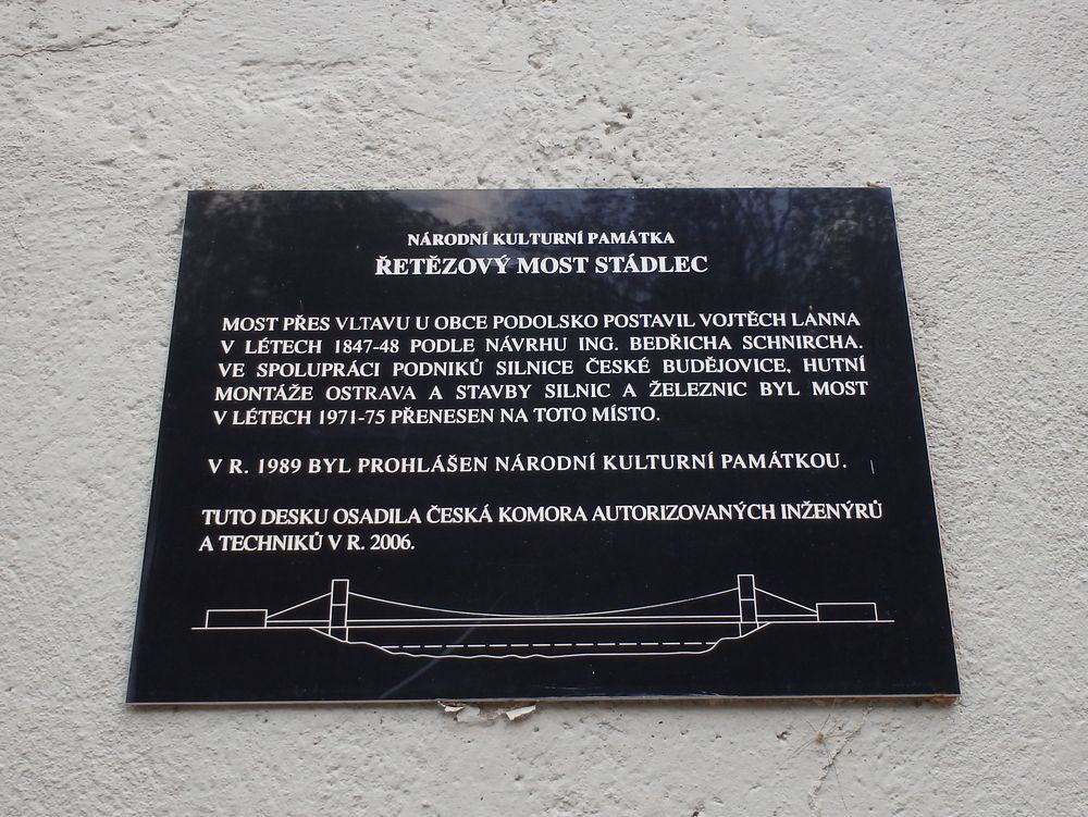 Další most, který jsme navštívili při našem výletu na kolech, byl řetězový most u obce Stádlec. Tento most je jeden z mála u nás dosud dochovaných řetězových mostů. Byl vybudován v letech 1847-1848 a původně přemosťoval řeku Vltavu u obce Podolsko. V té době byly nejbližšími mosty přes Vltavu most v Týně a po proudu řeky až v Praze. Most byl roku 1959 zapsán do Ústředního seznamu kulturních památek.  V roce 1960, když se začala napouštět Orlická přehrada, byl rozebrán a dva tisíce žulových kvádrů bylo očíslováno a spolu s 1100 kusů železných částí uskladněno do doby, než se najde vhodné místo k jeho novému sestavení. To se našlo právě u obce Stádlec na silnici třetí třídy směrem na Dobřejovice. Do té doby tudy doprava vedla jen přes brod a přívoz. Nová stavba mostu byla zahájena v roce 1971 a trvala čtyři roky. Nakonec bylo nutné 14 tun železných částí ze 102 tun nahradit kopiemi. Stavba –rekonstrukce tohoto historického mostu byla v Evropě unikátní. Most je dlouhý 147m a jeho nosnou konstrukci tvoří dvě dvojice silných řetězů uložených na žulových pylonech o rozměrech 4x9 metrů a výškou deset metrů nad vozovkou a ukotveny do čepů uchycených do železných desek v kotevních blocích. Dřevěná mostovka je nesena závěsy spuštěnými z čepů nosných řetězů. Most slouží dodnes s omezením zátěže na 1,5 tuny. Rachot, který se ozývá při přejezdu automobilů, připomíná zemětřesení. V roce 1989 byl prohlášen národní kulturní památkou.