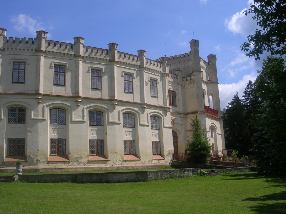 Jak jsem si předem v mapě zjistil, přes potok naproti nádraží je lávka a žlutá značka mě vede do pěkného stoupání vzhůru k zámku, který je sice v Bojkovicích, ale jmenuje se Světlov. Mírně opadávající zámek a zarostlý park. Škoda. V části zámku je uzavřený hotel. Pokus o privatizaci jako většinou. V malé části zámku je muzeum Bojkovicka. Krásné schodiště, návleky, vstupné 10 Kč. Těm 10 korunám ten koutek odpovídá.