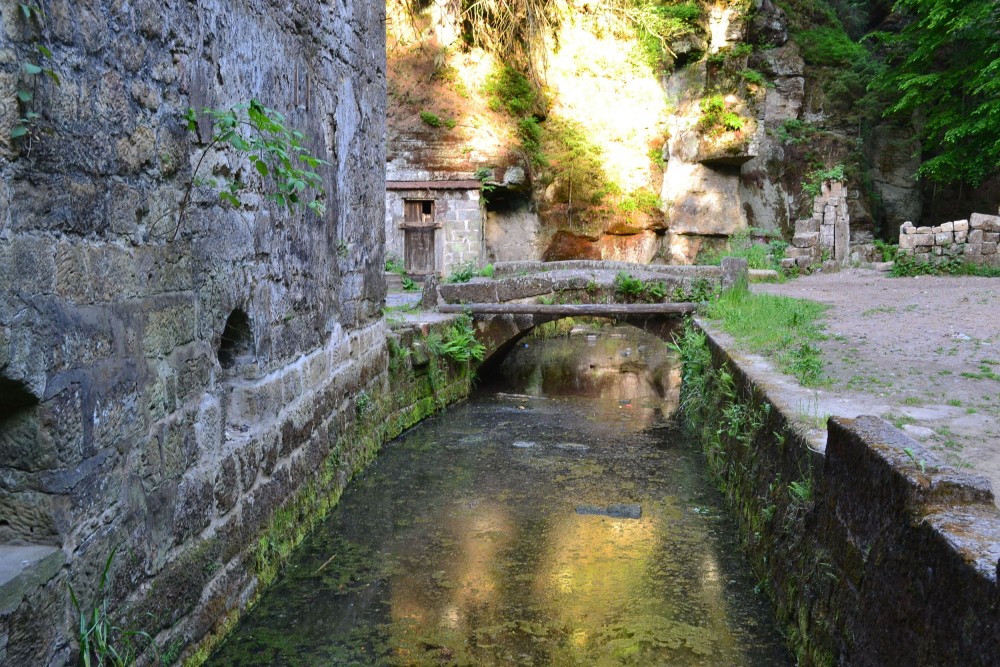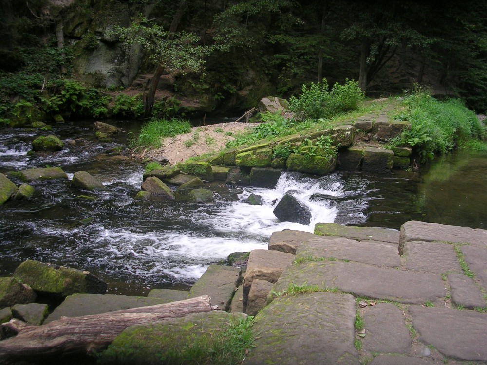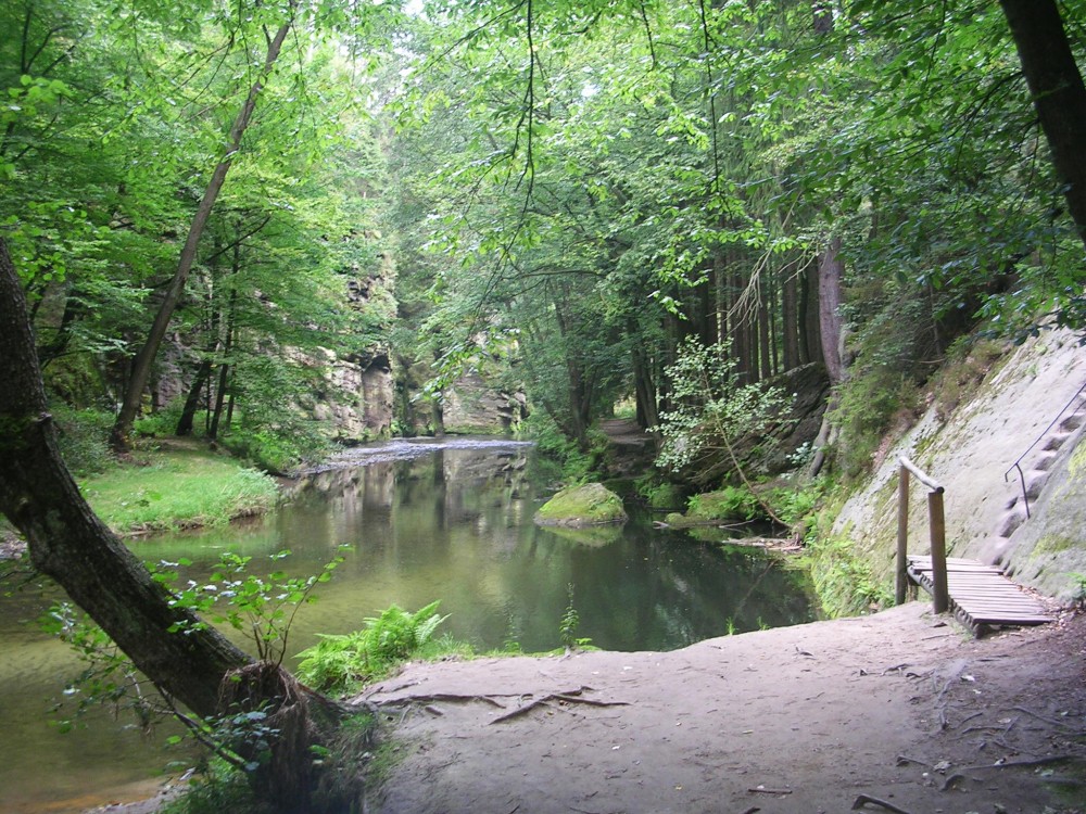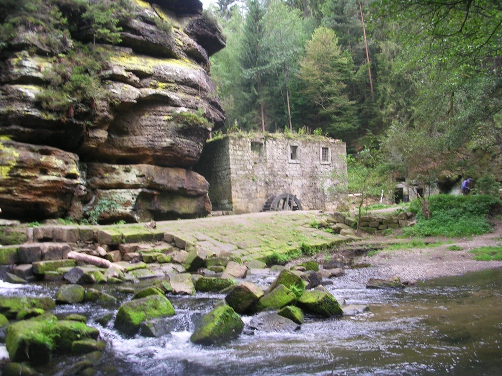 Ranní sluníčko vytahuje dva ospalce z pelíšků. Přidává se kohout, který krásně volá budíček. Jelikož snídaně je až po 8 hodině, tak nás ranní předsnídaňová procházka vede po žluté značce podél říčky Kamenice, která ale je pod naším mlýnem jen potůčkem. Přesto na tom potůčku byly nejméně dva mlýny. Ten náš, kde jsme ubytováni, a druhý, na který se jdeme po ránu podívat. Je to Dolský mlýn, který je populární z filmové pohádky Pyšná princezna. Cesta voňavým lesem je doprovázena zpěvem ptáčků, a tak cesta s našimi hůlkami pohodlně utíká. Dolský mlýn je vzdálen jen 2 km. Ještě zastavujeme u Hubertovy studánky a už je tu turistické rozcestí. Po modré se však nesmí, je uzavřena, a tak pokračujeme po žluté přes most nad Kamenicí. Až do teďka se šlo po pohodlné lesní cestě, ale teď už po horší a do kopce. Asi po 500 metrech se cesta svažuje až ke mlýnu.
