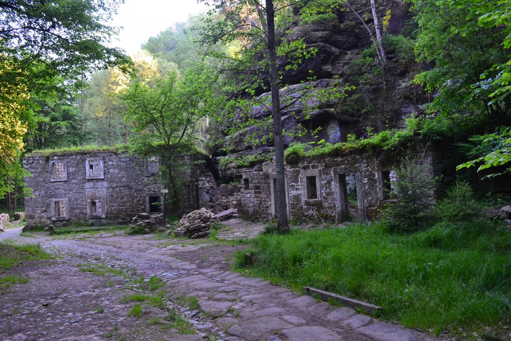 Otvírá se nám krásné panorama. Jak v pohádce se zjevuje Dolský mlýn, který je bohužel zříceninou. Musel to bývat bohatý mlýn. Ale zříceninou už byl i ve filmu, přesto tehdy i dnes má svůj půvab díky krásnému okolí. Dnes zůstaly jen kamenné obvodové zdi a zbytky původních přilehlých staveb. Po střeše není ani památky. A tak prohlížíme, prolézáme a fotíme. Je smutné, že tato krásná historická památka je v tomhle stavu i přes velkou snahu dobrovolníků o opravu. Je vidět, že smutný stav památky všechny klidné nenechává a snaží se pomoci k znovuzrození. Po půlhodině se obracíme podél bublajícího potůčku zpět k ubytování a hlavně na snídani. Žádný spěch, jen pohodička. Snídaně je připravena.  Na stole je připravená vaječná omeleta, rohlík s máslem a džemem. A k tomu kafíčko. I když je na výběr i čaj. Po snídani vyrážíme do Vysoké Lípy. Na parkovišti u Loupežáka necháváme modráska. Dál už po červené a s hůlkami šlapeme po České silnici lesem do mírného kopečka.