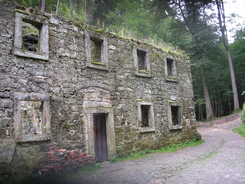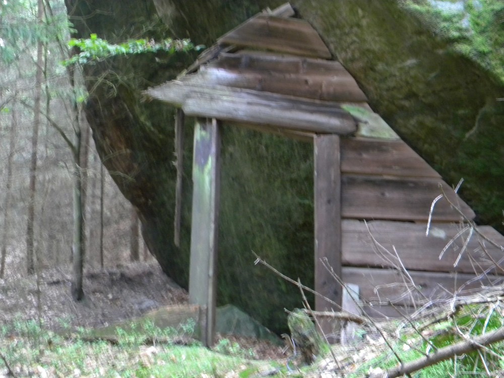 Cesta je dost mizerná. Našim cílem je chaloupka z Pyšné princezny. Červená značka mizí vpravo, ale my jdeme ještě dál asi 500 metrů po neznačené cestě. Za zatáčkou je vlevo rybníček, na jehož břehu měli kdysi filmaři svůj štáb a princezna svou šatnu. Ještě kousíček a vpravo, pod skalou, se objevuje poslední pozůstatek uhlířovy chaloupky. Je to sice už jen čelní stěna s dveřmi, ale je tady. A tak se myšlenkami vracím zpátky o 65 let, kdy jsem se zúčastnil coby uhlířovo dítě natáčení. Zase jsem stál mezi dveřmi, zase jsem se procházel  místy známými, kde obědvali jsme suché brambory, prohrábl jsem si zbytky popela z uhlířova milíře. Ještě kousek sádry, kterou kdysi filmaři použili na úpravy, a otáčíme směr cesty. Cesta je najednou nějak kratší, rychlejší. Půl kilometru před Loupežákem je značená odbočka k Šauštejnu, což jsme jako děti znali jako loupežnický hrad. Cesta lesem docela dost stoupá, je to trošku víc do kopce. Ale naše hůlky pomáhají překonat cestu přes schody a kořeny. Dva důchodci však šlapou statečně dál. Ale vstup do hradu je žebřík vedle žebříku. Je to makačka. Tady hůlky spíš překážejí.