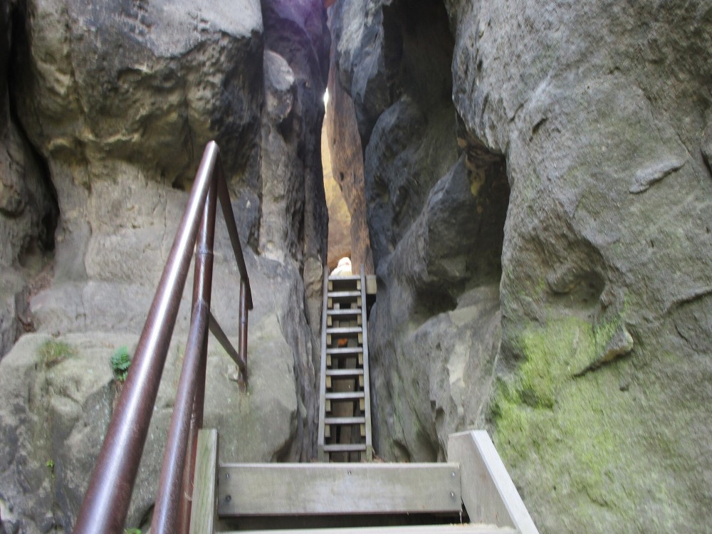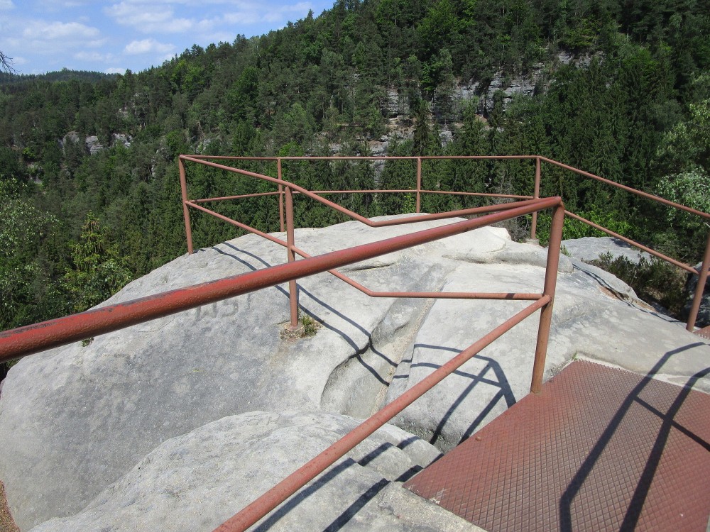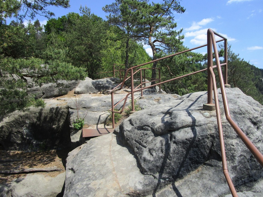 Po vystoupání na vrchol je hezký rozhled na Česko-saské Švýcarsko. Po zpětném sešplhání si cestu zkracujeme vyšlapanou stezkou. Je daleko pohodlnější a kratší. Na rozcestí se dáváme vpravo a po chvíli jsme u Loupežáka. Tentokrát si venku na zahrádce dopřáváme menší tekuté občerstvení. A to pivko i nealkoholické. Po návratu k modráskovi ještě taháme řízečky z krabice. Ani chleba k tomu není nutný. Po svačince ještě vyrážíme do osady Mezná. Tady měly být zachované chaloupky, ale jsme zklamaní, a tak otáčíme do Jetřichovic, ty však jen projíždíme. Zajíždíme do Doubice ke Staré hospodě. Ta je známá svými sochami ze dřeva. Moje představa o několika sochách se ztrácí v obrovské kupě všech možných dřevěných výtvorů.  Je to tu hlavně pro dětičky, je to strašně kýčovité, přeplácané. A tak si na zahrádce dáváme kafčo a vracíme se k ubytování ke Starému mlýnu. Na chvíli jdeme na pokoj si odpočinout. Po odpočinku ještě se jedeme podívat k bývalé ozdravovně, kde jsem jako dítě byl a odkud naši dětskou partu do filmování vybrali. Bohužel fotit se dá jen přes plot, neboť zahrada je uzavřena, ač je tam mrtvo. Nějaká fotka přes plot vyšla, a tak otáčíme. Ještě několik fotek půvabných chaloupek přilepených ke skále. Vracíme se do Mlýna na večeři. Je 6 hodin podvečer, a tak si jdeme ještě na chvíli sednout dolů do restaurace na jídlo. K večeři jsou výpečky a pivo. Večer končí na pokoji na gauči.