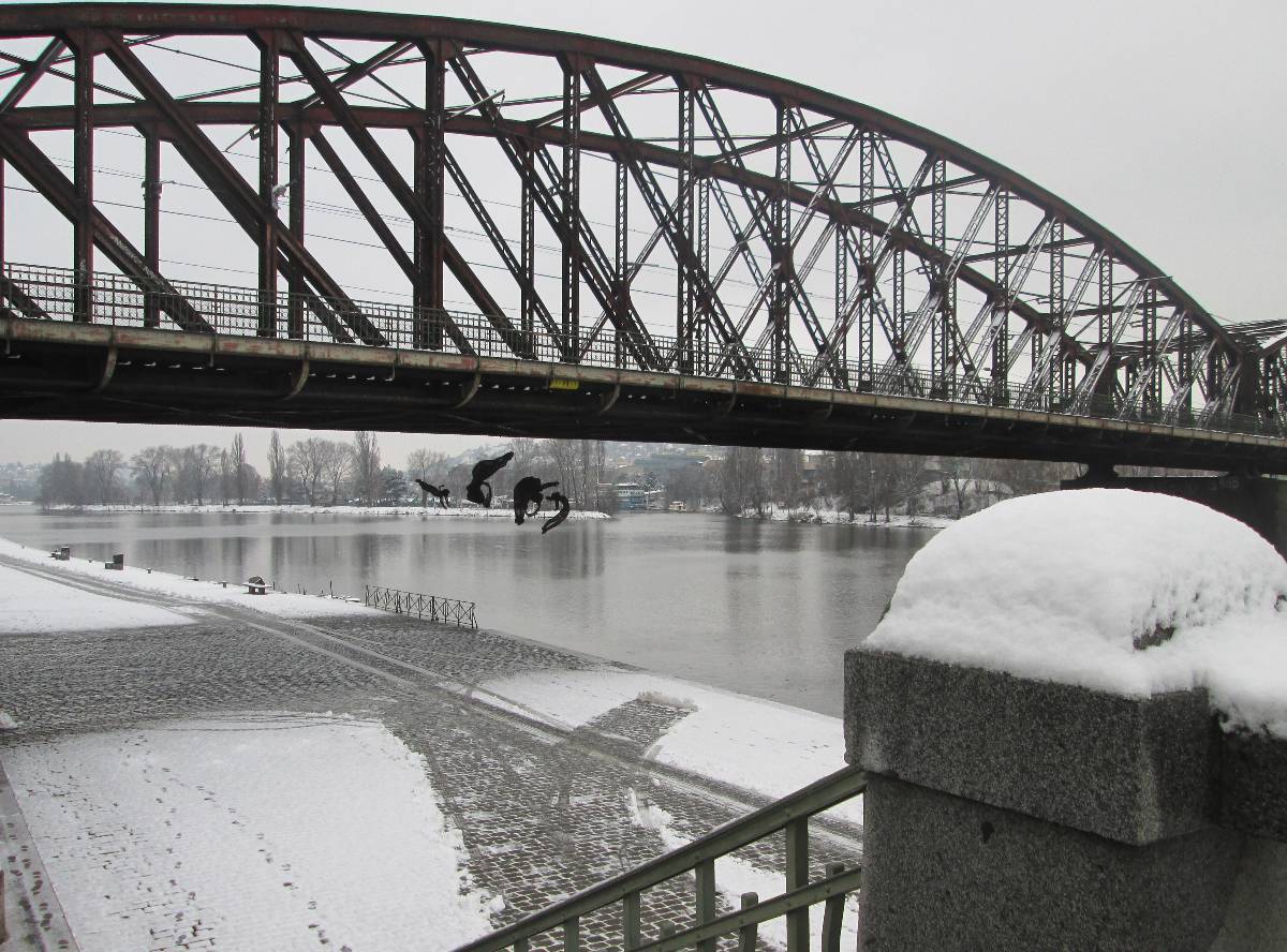 Tak jsme se od železničního mostu brouzdali s prokřehlými konečky prstů po chodníku polomokrou břečkou, vdechovali vlhký, studený vzduch, okořeněný výfukovými plyny, které dovedou zpříjemnit činnost našeho dýchacího ústrojí hlavně v tomhle počasí. Obyčejně se klasickému panoramatu Prahy vyhýbám, ale když už jednou napadl ten sníh, a když už jsem tu, tak pár fotek neuškodí.