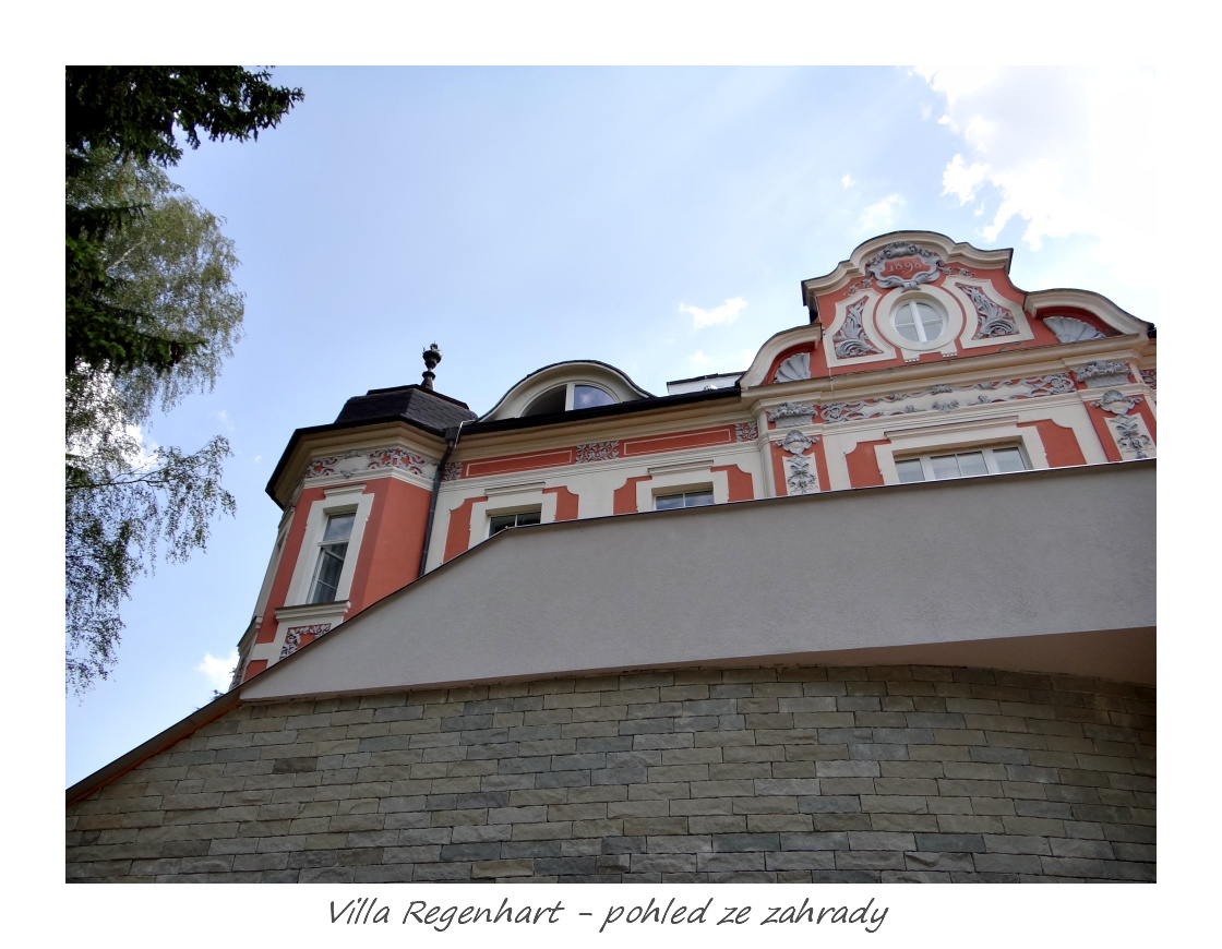 Vila Regenhart, bývalé sídlo Všeobecné zdravotní pojišťovny, byla postavena koncem 19. století frývaldovským majitelem textilky. Ernst Regenhart, původem z Vídně, s manželkou Louisou si ve svahu nad řekou Bělou nechali postavit dle plánů vídeňských architektů bratrů Mayrederových v neobarokním stylu rodinné sídlo. Vila se stavěla devět let a parkově upravený areál byl obohacen ještě stavbou zahradnického domku ve stejném stylu. Oba objekty postavil domácí stavitel Alexander Nitsche. Troufám si říct, že bylo pro objekt štěstí, že unikl jak v období před rokem 1989, tak i po tomto roce rozsáhlejším úpravám či přestavbám. V roce 2012 začala přestavba vily v moderní Spa&Wellness hotel, název ponese po původních majitelích VILLA REGENHART.