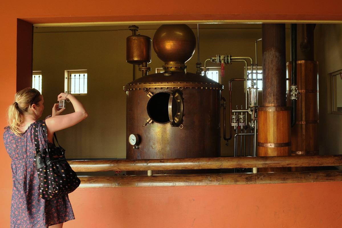 Samotný vzhled rhumerie má na svědomí mauricijský architekt Maurice Giraud a nutno říct, že stavby do okolního prostředí opravdu přirozeně zapadají. Základní surovinu, cukrovou třtinu, si destilerka sklízí na vlastních polích. „Máme dokonce vlastní odrůdu, stvoly sklízíme ručně a jakmile z nich lisováním získáme šťávu, tak putuje do nerezových tanků. Každý z nich má objem 25 hektolitrů,“ tvrdí náš průvodce. K třtinové šťávě se přidají kvasnice (mnohé rhumerie druh kvasnic přísně tají) a po proběhlém kvašení probíhá samotná destilace. Tu u nás známe pod pod slovem „pálení“. Ostatně rum není nic jiného, než pálenka. V Chamarel destilují podle typu rumu, k bílým rumům jsou určeny čistě měděné destilační kolony o objevu 20 hl. Následně se nápoj nechá odležet, což znamená jeho stočení do dřevěných sudů, v nichž zraje nejméně půl roku. Ovšem ty „zajímavější“ kousky si v sudu hoví 4 či 6 let. Rumy z Chamarel jsou jak světlé, tak tmavé a dokonce tady připravují speciality, jako je kávový rum, což mě, silného kofeinistu a milovníka kávy skutečně potěšilo.