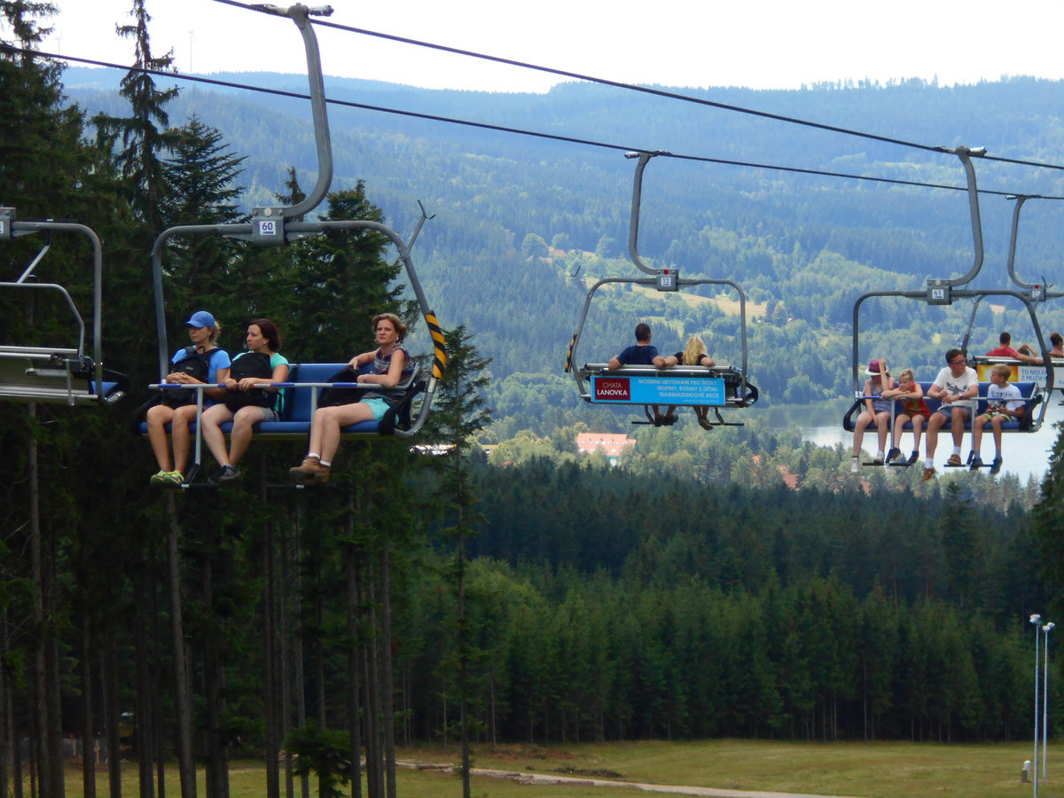 Tentokrát jsme se vydali na Stezku korunami stromů. Všude shon a ruch, parkoviště se postupně zaplňovalo a u pokladen zjišťuji, že "Stezka" slaví 4. narozeniny. Můžete jet na Kramolín lanovkou nebo busem a jsme u "Stezky", kde hraje kapela, pohybují se všude rodiny s dětmi, kočárky, cyklisté, vozíčkáři, psi. Představte si, před vstupem na "Stezku" můžete psa ponechat v boxu s vodou a on tu hodinku počká.
