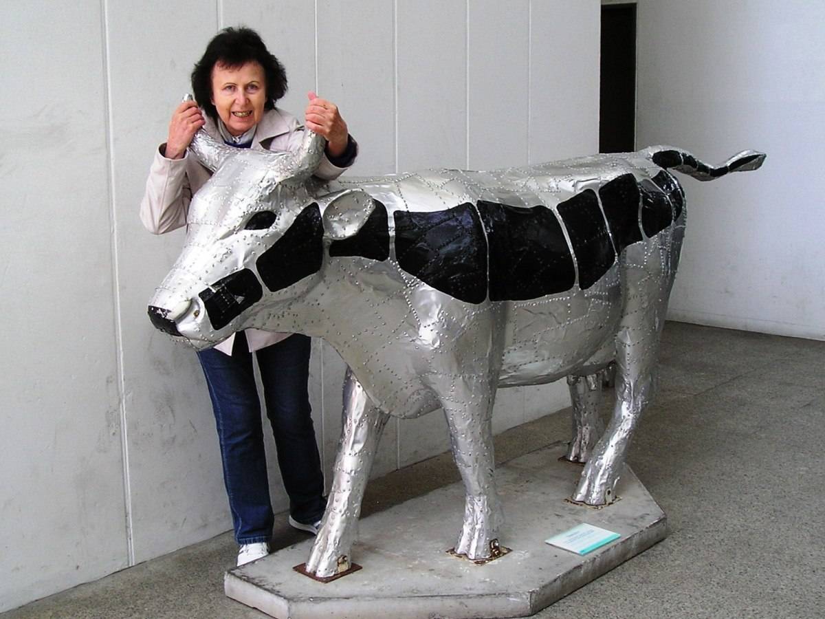 Vlak zastavil. Hned jako první z něho vystoupily ony dvě. Podchod, chodba k východu a pak už Jarka měla halucinace – aspoň si to myslela. „Evo, vidíš tam na konci taky krávu?“, optala se. „Kráva na nádraží? Co by tady dělala?“, opáčila Eva. „Tak to už je se mnou špatné“, prohodila nahlas Jarka. V tom se Eva rozesmála: „Fakt, ona tam je, a ty nemáš žádné halucinace“. Byla sice jen plechová, ale z dálky vypadala jako živá. „S ní mě musíš vyfotit“, žadonila dětinsky Jarka. Cvak, hotovo. S krávou se den zdál být hned veselejší.