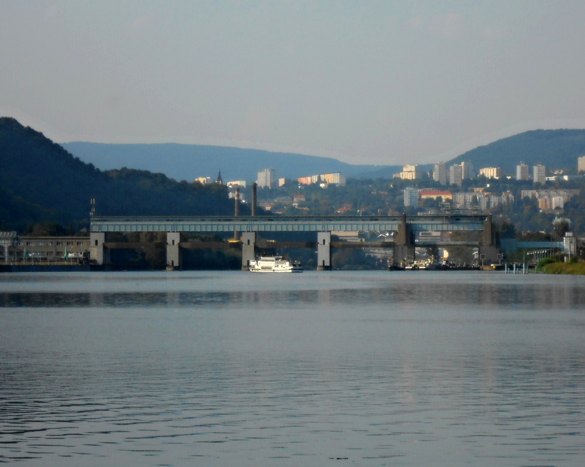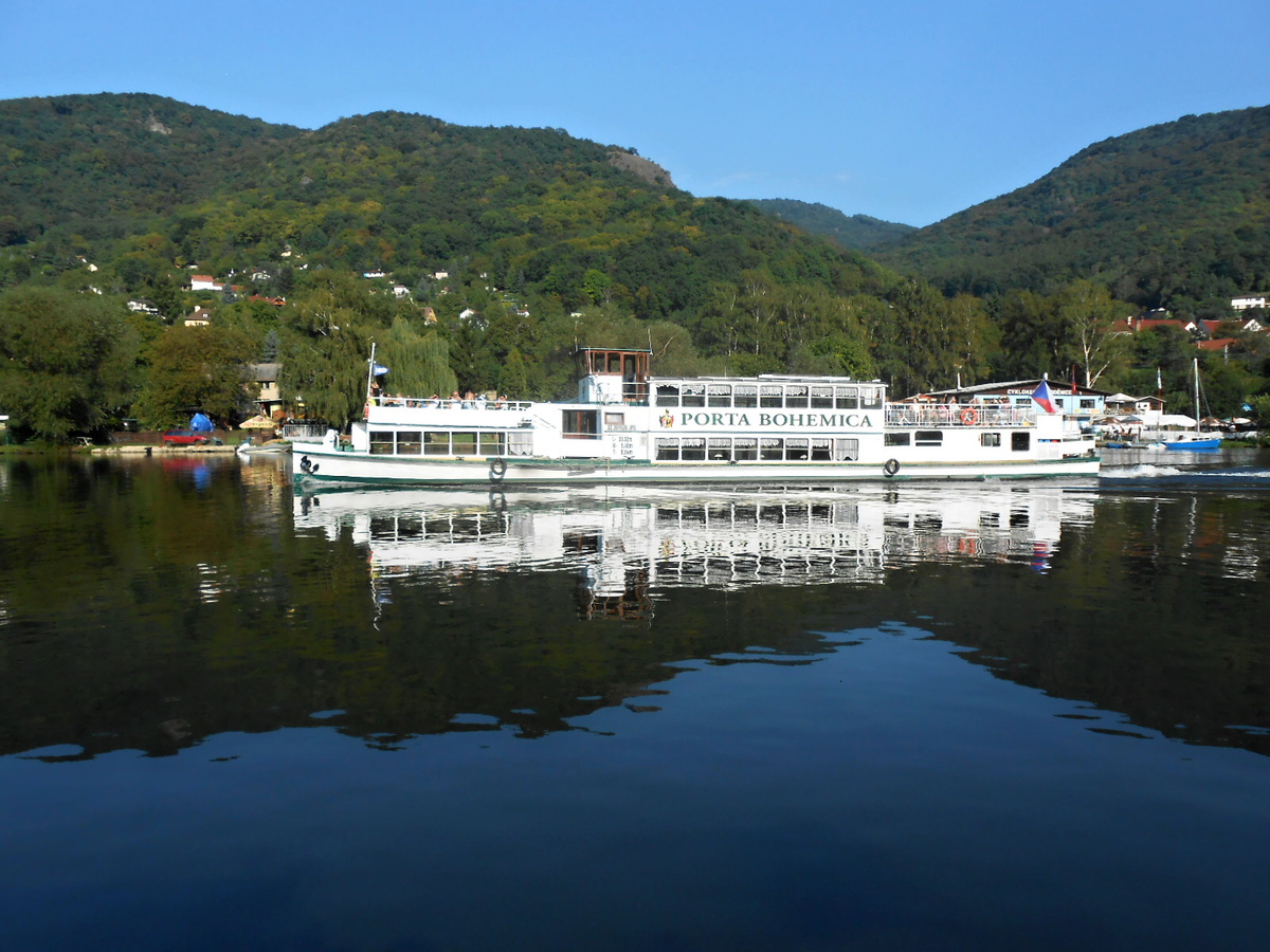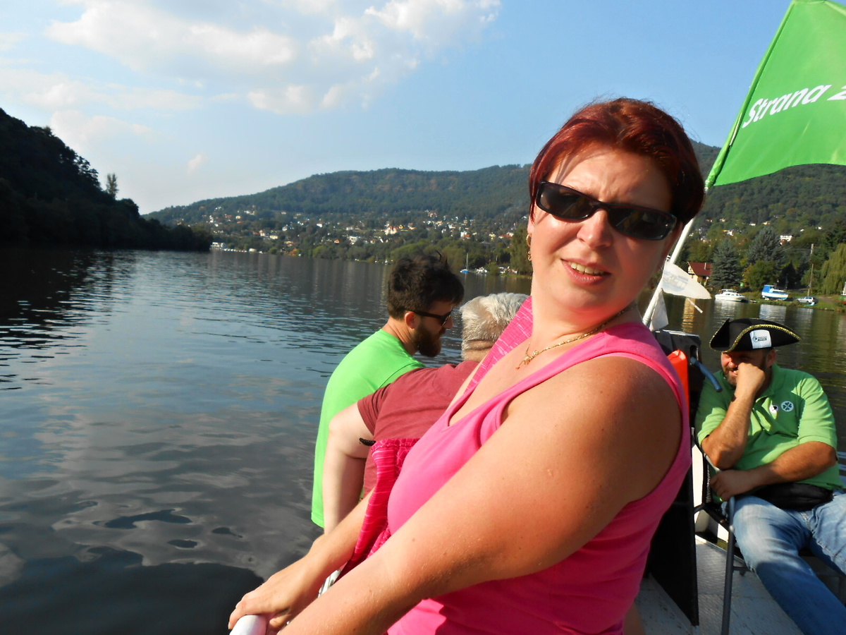 Ústí nad Labem má krásné okolí a z lodě je to opravdu zážitek. Kolem jsou loděnice, chatové osady, dokonce je z lodě vidět i ta naše. Na fotce je to chaloupka s šedou střechou uprostřed zeleně. Potkali jsme i velkou výletní loď Porta Bohemica, která pluje pravidelně z Ústí nad Labem do Litoměřic a zpátky od března do října. Pro zájemce lze bližší informace najít na internetu. Při plavbě zpět je krásný pohled na dominantu města hrad Střekov a Střekovská zdymadla. Doufám, že vás pohled z lodi na fotkách zaujme, jako nás.