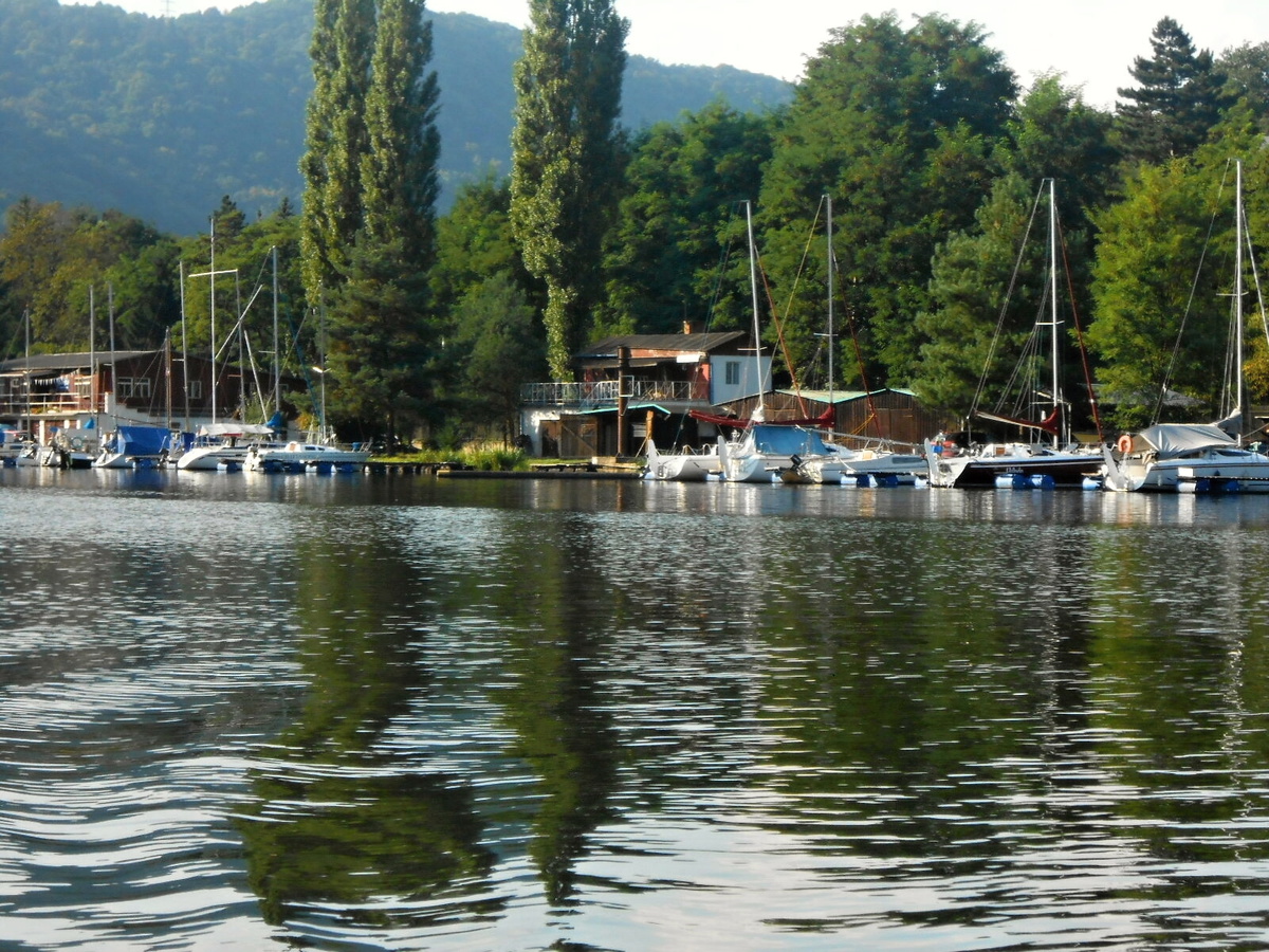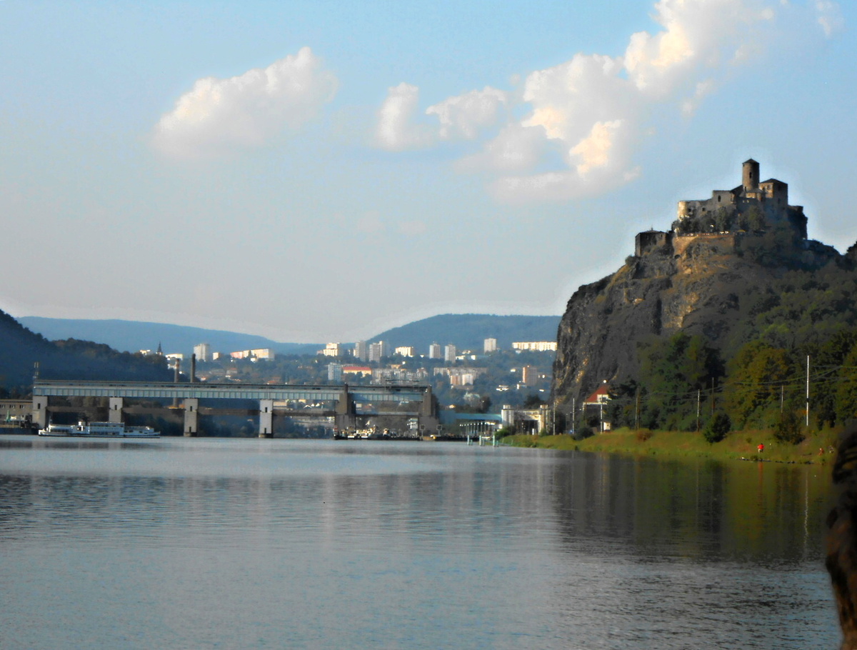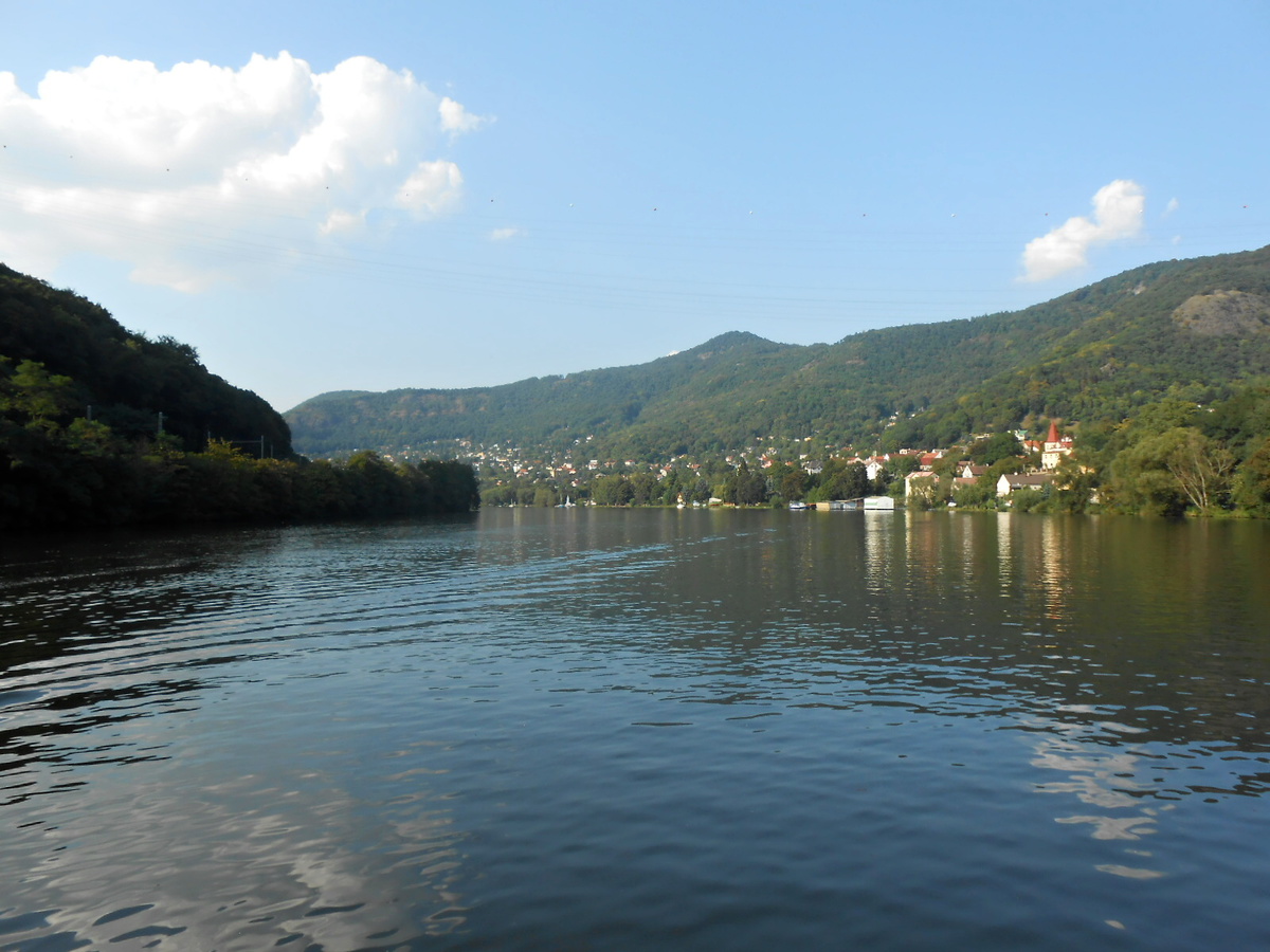 Ústí nad Labem má krásné okolí a z lodě je to opravdu zážitek. Kolem jsou loděnice, chatové osady, dokonce je z lodě vidět i ta naše. Na fotce je to chaloupka s šedou střechou uprostřed zeleně. Potkali jsme i velkou výletní loď Porta Bohemica, která pluje pravidelně z Ústí nad Labem do Litoměřic a zpátky od března do října. Pro zájemce lze bližší informace najít na internetu. Při plavbě zpět je krásný pohled na dominantu města hrad Střekov a Střekovská zdymadla. Doufám, že vás pohled z lodi na fotkách zaujme, jako nás.