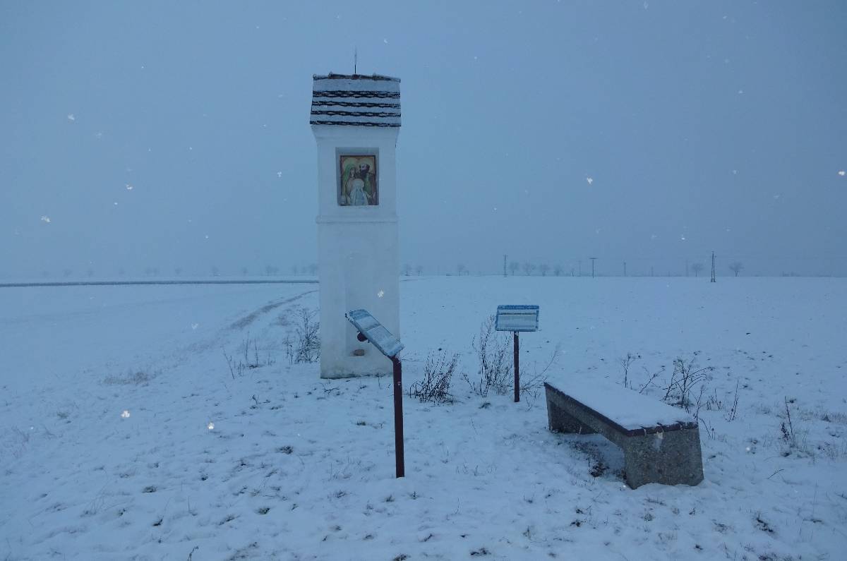 Viděla jsem tu spoustu nádherných západů slunce i utíkala před rychle se ženoucím deštěm. Viděla jsem suchou rozpraskanou zem, žárem se tetelící vzduch i se brodila loužemi. Jen sníh jsem tu zažila jen jednou. Nejsilnější zážitek odtud mi ale připravila mladá maminka, která se ke kapličce vypravila s kočárkem, asi tříletým dítětem a pejskem. Zastihla jsem ji v předpoledním sluníčku, sedící na lavičce. Kojila miminko a starší dítě s pejskem pobíhalo  okolo. Prohodila jsem s madonou pár slov a tiše odešla, nechtíc rušit tu posvátnou chvíli.