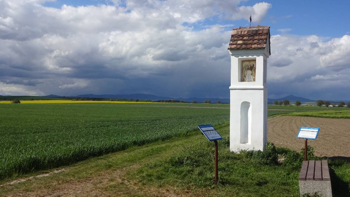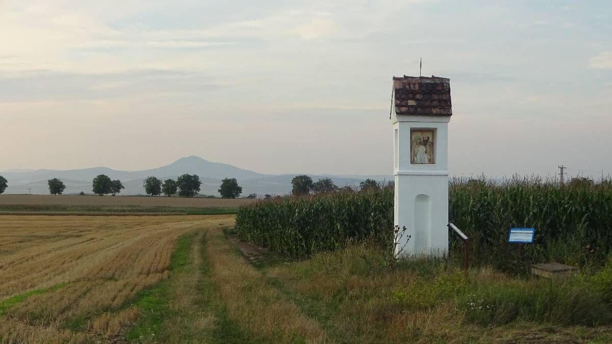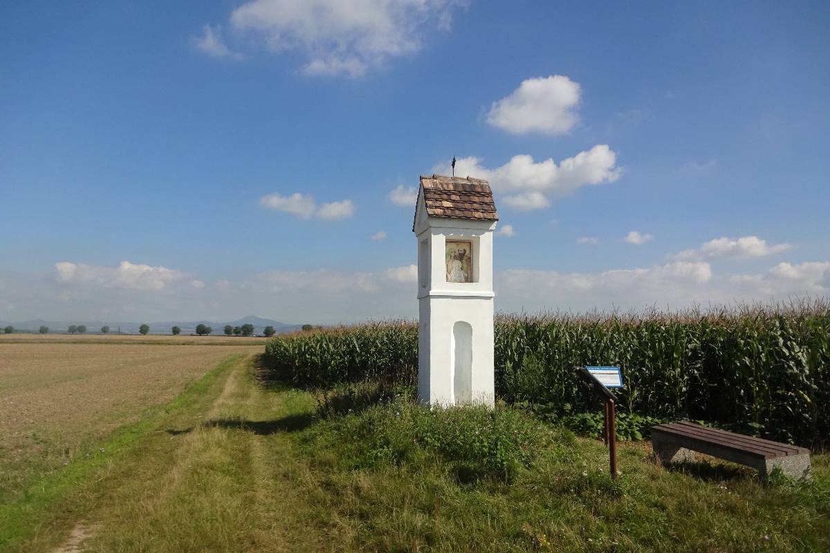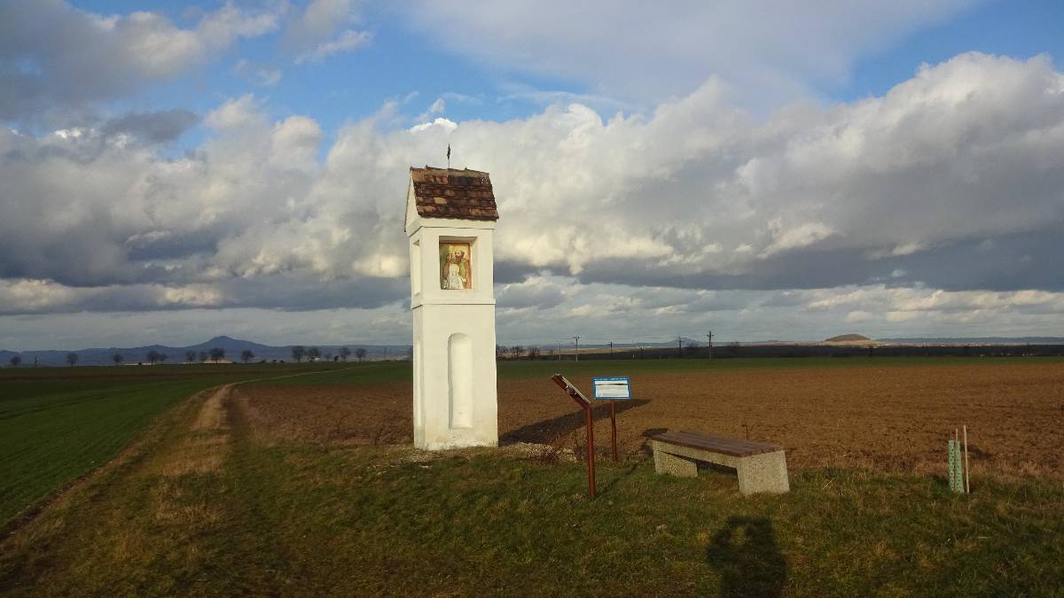 U kapličky je lavička a tabulky s popisky. Otvírá se tu totiž pohled na překrásné panorama Českého středohoří zleva od Hazmburku přes dominanty Lovoš, Milešovku a Kletečnou až po Radobýl, Dlouhý vrch a Sovici úplně vpravo. Skoro nikdo sem nechodí, jen sem tam potkám nějakého pejskaře. Dají se zahlédnout srny, zajíc, bažanti, vyplašila jsem koroptve. Přelétají dravci, nad hlavou mi zpívají skřivani. Navečer z roudnického letiště vylétají letadélka, zakrouží a vrací se zpátky.
