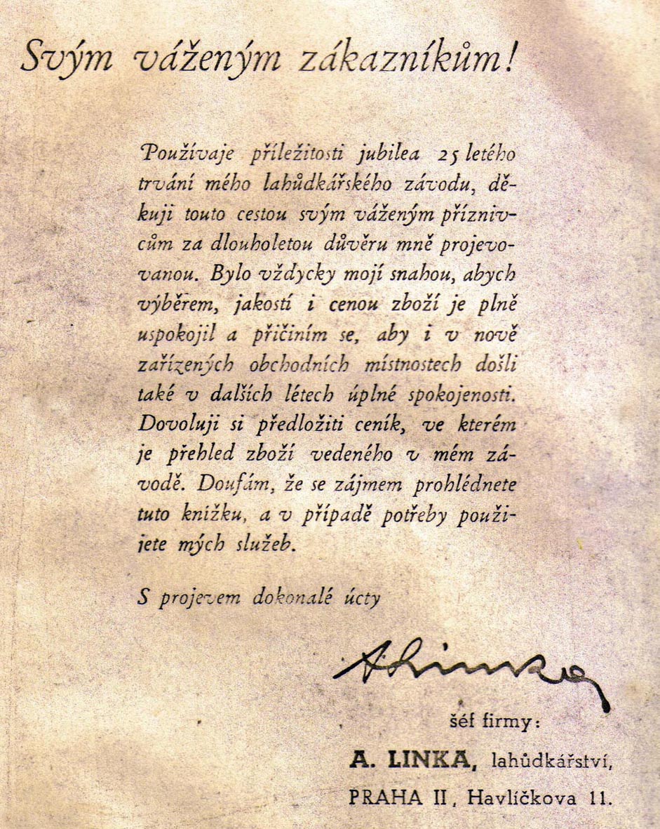 Nabídkový katalog, plný reklam - ano, už tenkrát s ním pracoval - čítal bezmála stovku stran, nad jejichž nabídkou přecházel zrak. Prolistujme teď krátce útlou brožuru, abychom zjistili, po čem se utloukali tehdejší pražští mlsní. Jenom sektů tuzemské produkce měli u Linků celý tucet, originál šampaňských dokonce osmnáct. Dámy v tom čase milovaly cukrovinky. Především pro ně Linka nabízel třeba římské švestky - s i bez ořechů (vůbec nevím, oč šlo), pomeranče plněné ovocem, zázvor v medu a desítky dalších lákadel. Hitem byly červené i zelené třešně v alkoholu, samozřejmostí nabídky pak „pravý havajský ananas“.