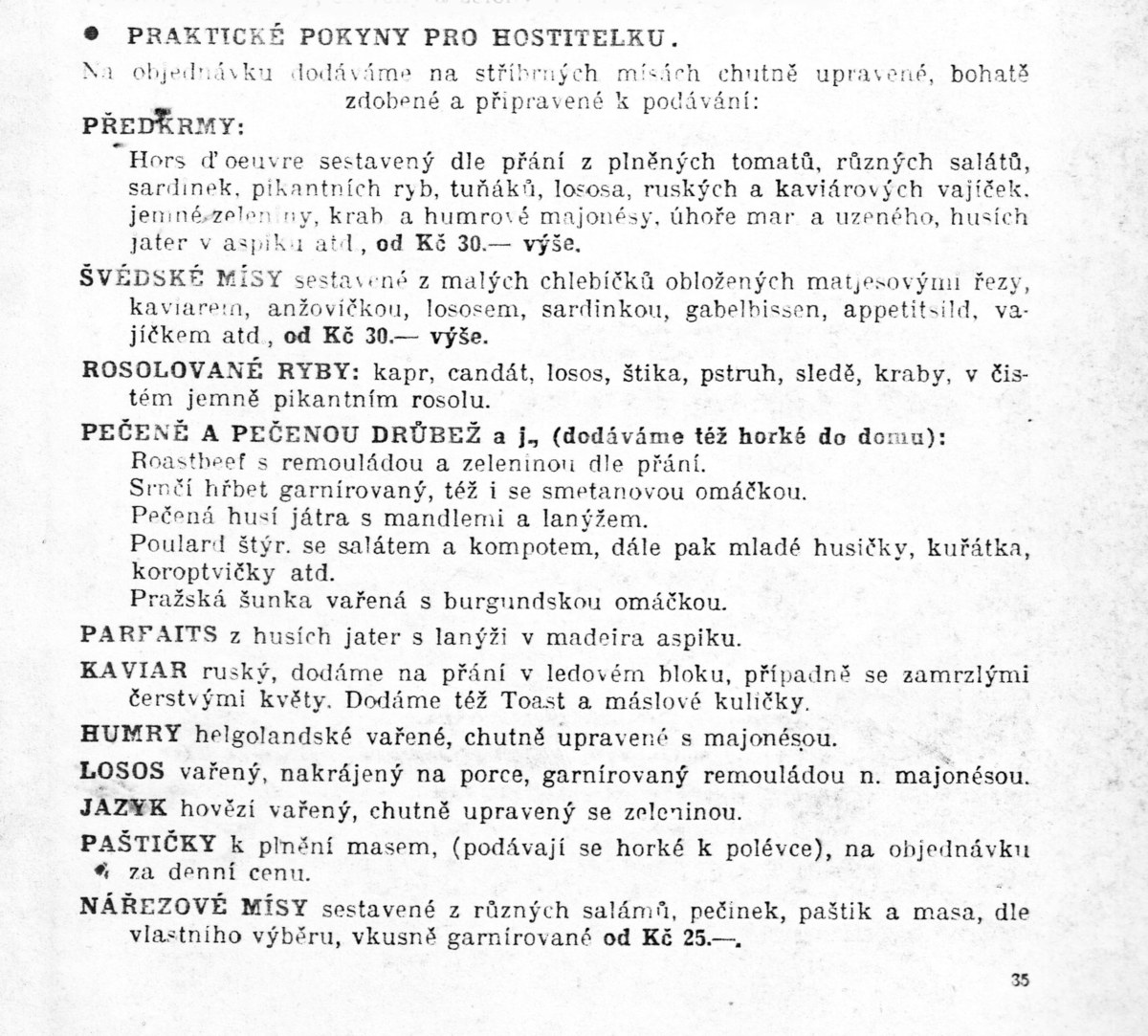 Silný byl part studené kuchyně, jedenáct druhů salátu, v čele s pověstným Linkovým vlašským. Také - jak jinak - „obkládané chlebíčky v různé úpravě, kus od Kč 1,- výše“.