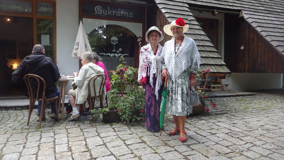 Sobotní ráno splnilo to, co sice bylo předpovězeno, avšak nikdo tomu nevěřil. Rožnovské nebe se zahalilo do tmavě šedého flóru a z nebe se řinuly provazy deště. Nikomu se ven moc nechtělo, a tak jsme se rozhodli vyčkat lepšího počasí na improvizované tiskové konferenci v recepci hotelu. V suchu jsme vzpomínali na skupinu, která se ráno vydala na Pustevny. Hotel jsme za veselého hlaholu opustili až před polednem, kdy nám vyhládlo. Pivovarská restaurace nás sice pro velký nával nepřijala, ale poobědvali jsme jinde. S nacpanými bříšky jsme se se stále otevřenými deštníky přemístili do areálu rožnovského skanzenu, který byl poloprázdný, neb rožnovské slavnosti hatilo počasí. V dřevěném kostelíku jsem otevřenými dveřmi zahlédla zpívajíci turisty. Rychle jsem přivolala zbytek naší skupinky a vešli jsme do kostela. Zpěv však právě ustal, ale k naší prosbě a oboustrannému potěšení nám zazpívali dvě písně. Byl to zřejmě nějaký kostelní sbor, ženy, muži, mladí, staří a zpívalo jim to moc pěkně. Ani frgály neměly chybu, stejně jako posezení ve stylové kavárničce. Mezitím přestalo pršet a v parku to začalo svátečně žít.