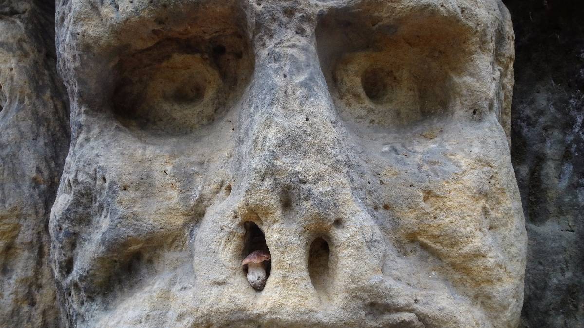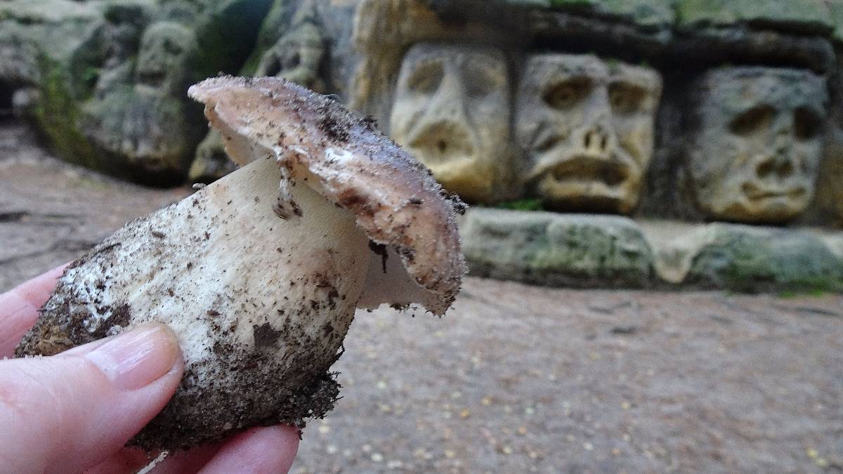 Stojím mezi stromy a hledám místo pro fotografování a vtom se podívám na zem. Ne, opravdu tu nejsem kvůli houbám, ale u nohy tu pro mě vystrčil hlavu krásný "pravák". Jak se dral na svět, vyzdvihl na svém kloboučku vrstvu písku a téměř s ním splynul. Možná proto ho žádný z turistů, kterých tu chodí habaděj, neviděl. A pak mi ukázal ještě pět bratříčků.Podle mapy při cestě za harfenicí má být ještě další kaple, kterou jsem zatím neviděla. Rázuji po cestě a ptám se pocestných, jestli je k ní ještě daleko. Pak jsem se však prohnula smíchy, protože paní mi s údivem ukázala, že stojíme prakticky u ní. Nebýt oněch pocestných, šla bych s hlavou v oblacích a s praváčky v sáčku od svačiny světa kraj a nenašla ji. Kaple sv. Máří Magdaleny je dalším ve skále vytesaným dílem Václava Levého.