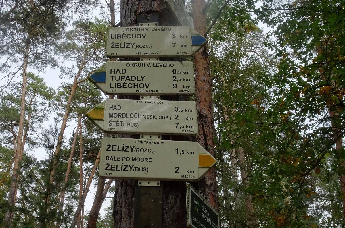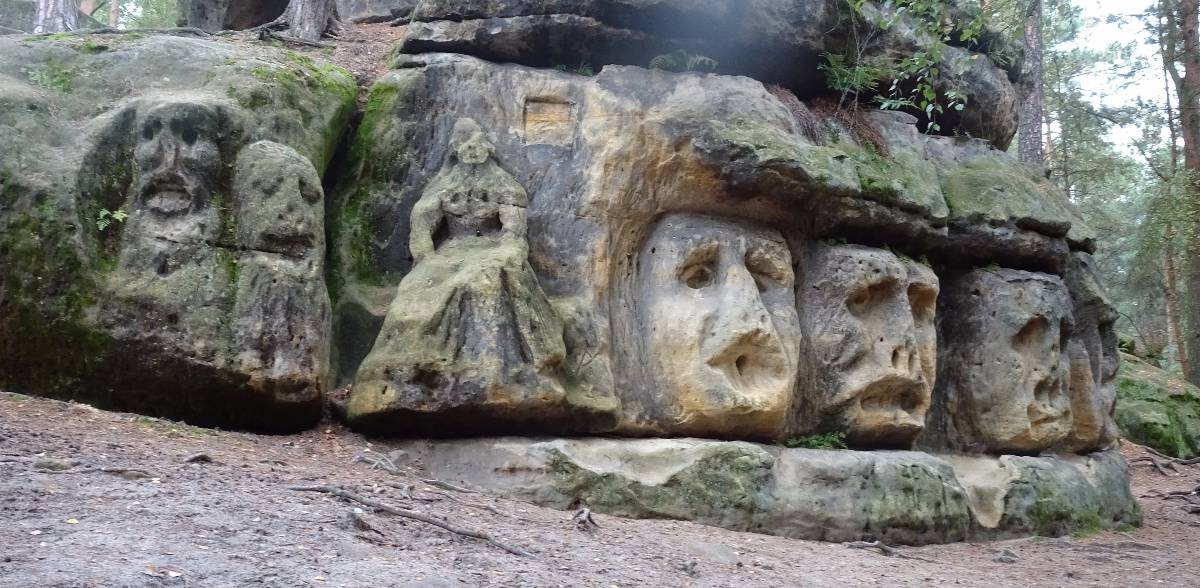 Pohodlná cesta vede dál romantickou krajinou plnou skalek, ale v létě také borůvek a nyní hub. Však se také z lesa vynořují postavy, nesoucí plné košíky. Já tu však nejsem kvůli houbaření, nýbrž kvůli turistice. A proto se kolem Ješovických louží, ve kterých žijí listonoh letní a žábronožka letní, ubírám k další zajímavosti. Tou je devítimetrový, v polovině sekerou přeťatý had, vytesaný ve skále. Je to dílo Václava Levého. Nadaný mladík v první polovině 19. století v nedalekém liběchovském zámku pracoval jako kuchařský pomocník. Ve volných chvílích v okolních lesích "upravoval" skály. Stal se sochařem a dokonce i prvním učitelem Josefa Václava Myslbeka. Pochovaný je na Vyšehradském hřbitově (viz. Na Vyšehrad po stopách osobností české historie ) ve společném hrobě s jeho přítelem Karlem Purkyněm. Asi 500 m od hada je další dílo Václava Levého, a sice harfenice, hlavy a jeskyňka, vše opět vytesáno v pískovcové skále. Nejsem tu zdaleka poprvé, ale znovu stojím v obdivu u jedinečného díla a lituji, že jej za pomoci vandalů hlodá zub času.