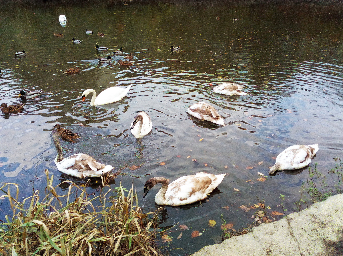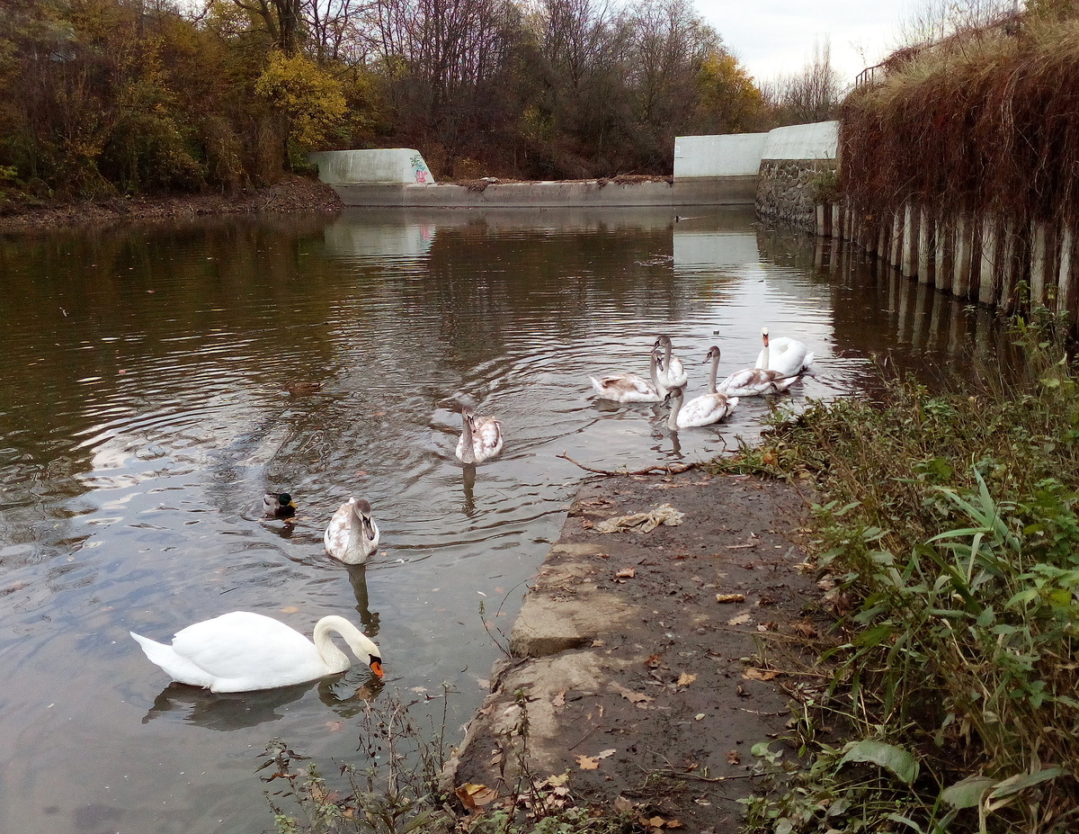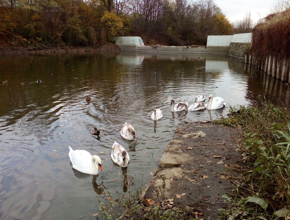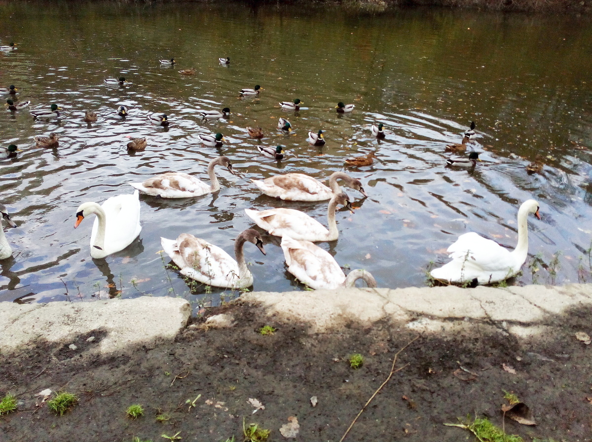 Nejprve musím vysvětlit název tohoto článku. Není v tom symbolika, ale prostě jen to, že jsem labutě i hřbitov fotila v jednom dni. Byl to pátek a já jsem šla vyvenčit naše pejsky, abych se trochu provětrala. Potkala jsem sousedku, taky se psem, a tak jsme šli k rybníku. Cestou jsem se dozvěděla, že se na rybníku objevily labutě. Kachniček je tam požehnaně, ale labutě tam byly naposledy loni v únoru. Taky jsem o tom psala. Tentokrát jich je 8. Dvě bílé a šest mladých, které jsou krásně šedobílé. Když jsem se přiblížila, tak na mě jedna bílá se sykotem hned vystartovala. Řekla jsem jí ať je v klidu, že si je chci jen vyfotit, a ona se vrátila do vody. Hádám, že jsou z Habrovického rybníka, nedávno tam byl výlov. Ještě musím podotknout, že se to neobešlo bez pádu, jednoduše jsem uklouzla po bahně a odnesla to zadní část těla. Naštěstí jen zašpiněným oděvem. Holt fotografická vášeň nehledí na podmínky.