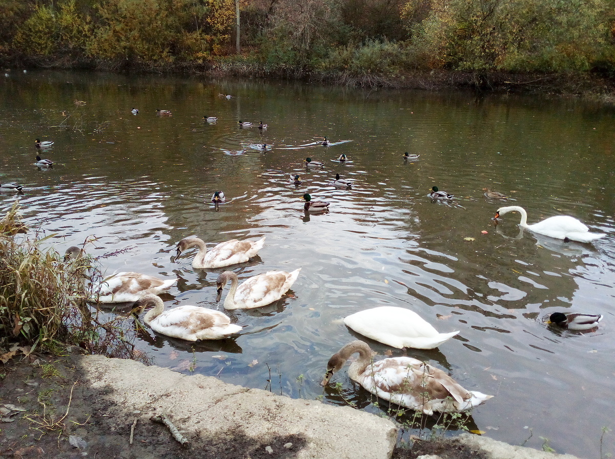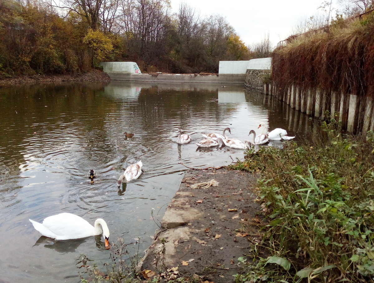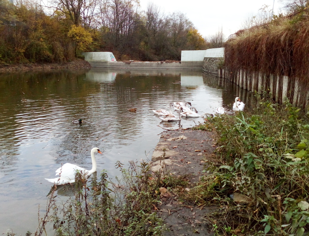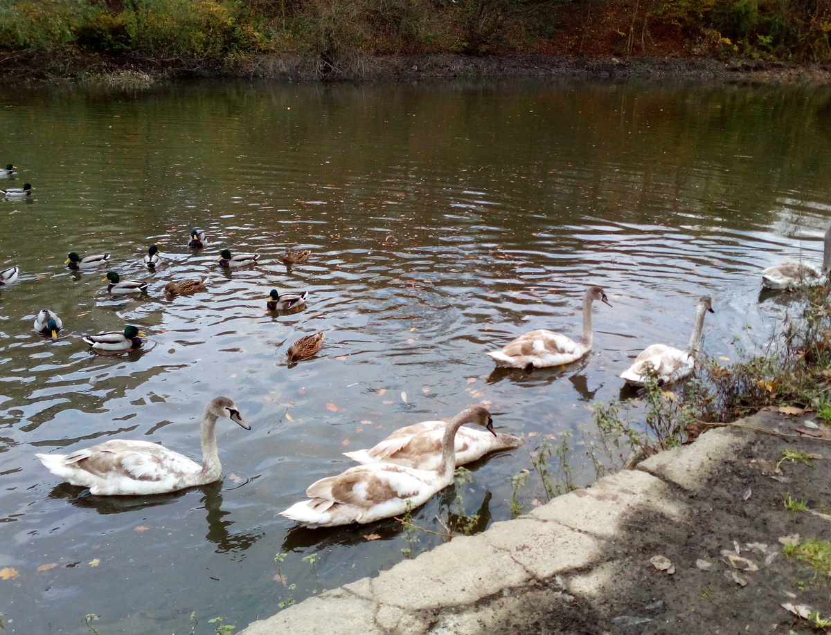 Nejprve musím vysvětlit název tohoto článku. Není v tom symbolika, ale prostě jen to, že jsem labutě i hřbitov fotila v jednom dni. Byl to pátek a já jsem šla vyvenčit naše pejsky, abych se trochu provětrala. Potkala jsem sousedku, taky se psem, a tak jsme šli k rybníku. Cestou jsem se dozvěděla, že se na rybníku objevily labutě. Kachniček je tam požehnaně, ale labutě tam byly naposledy loni v únoru. Taky jsem o tom psala. Tentokrát jich je 8. Dvě bílé a šest mladých, které jsou krásně šedobílé. Když jsem se přiblížila, tak na mě jedna bílá se sykotem hned vystartovala. Řekla jsem jí ať je v klidu, že si je chci jen vyfotit, a ona se vrátila do vody. Hádám, že jsou z Habrovického rybníka, nedávno tam byl výlov. Ještě musím podotknout, že se to neobešlo bez pádu, jednoduše jsem uklouzla po bahně a odnesla to zadní část těla. Naštěstí jen zašpiněným oděvem. Holt fotografická vášeň nehledí na podmínky.