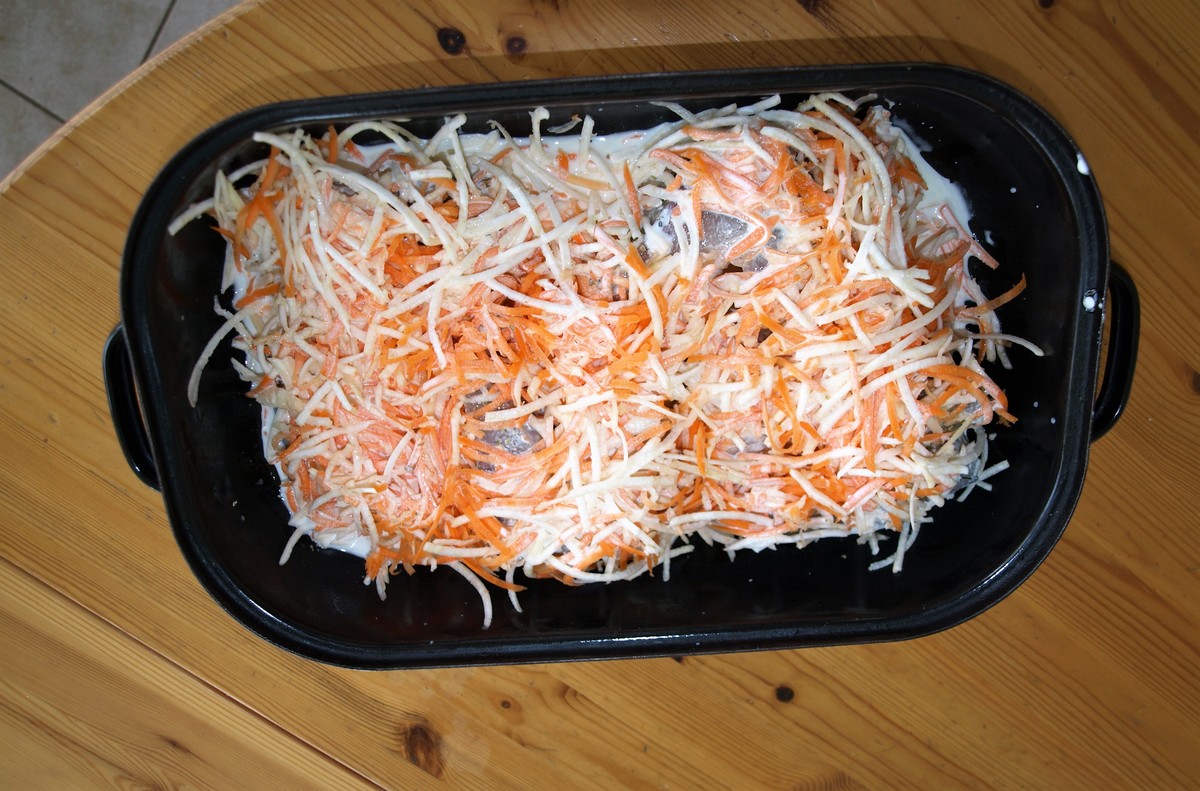 Omyté porce kapra nebo jiné ryby dobře osušíme, osolíme a hojně posypeme oreganem. Naskládáme do máslem vymazaného pekáčku,zasypeme zeleninovou směsí a zalijeme šlehačkou nebo jogurtem tak, aby byla zelenina i ryba pokryta. Dáme asi na půl hodiny péci na 150 st. C. Hotový pokrm podáváme s vařeným nebo pečeným bramborem. Výborné chutě pečených brambor dosáhneme, když je předem uvařené pečeme podélně rozkrojené ve slupce na vrstvě soli. V některých rodinách si však jako přílohu oblíbili rýži. Originalitě se zkrátka meze nekladou.