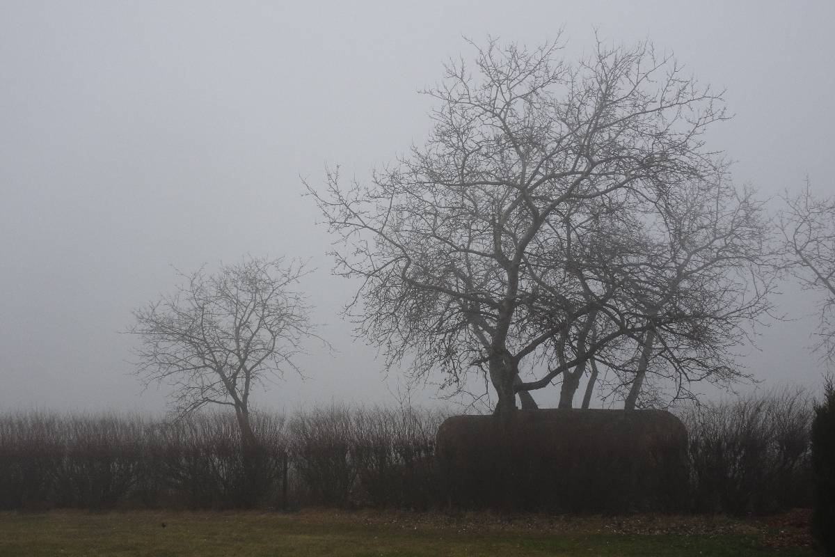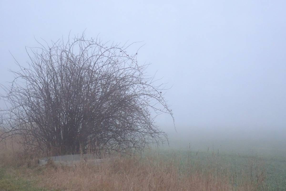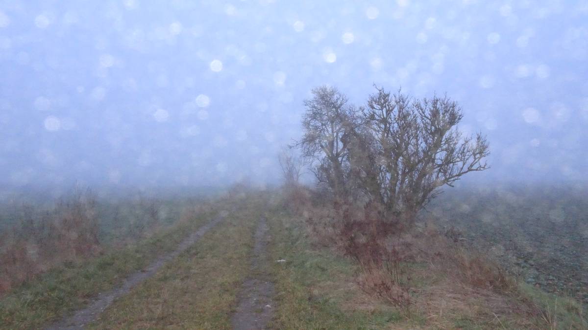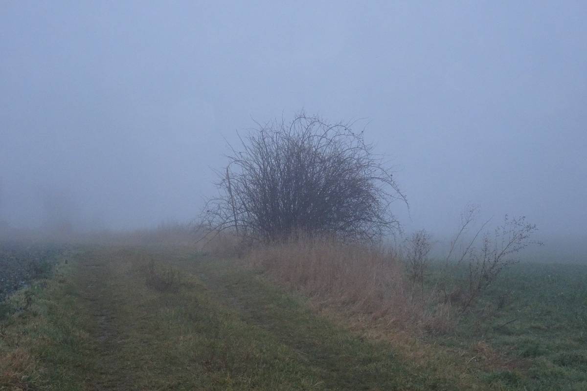 Pro tuto chvíli jsem ale nebojsa a směle to NIC prorážím. Cestu mám pod nohama a sem tam se přede mnou vynoří osamělý keřík na mezi. Při jejich zvěčňování zjišťuji, že mlha prostoupila i můj foťák. Když už si začínám myslet, že pod kapličkou je propadlo a štíhlá stavbička se tam pro dnešek schovala, najednou bíle prosvítí mlhu a kyne mi na pozdrav. Však už jsme se nějaký čas nesetkaly. Tak rychle pár snímků a honem domů. Bílá tma se totiž nebezpečně začíná kamarádit s tou černou.