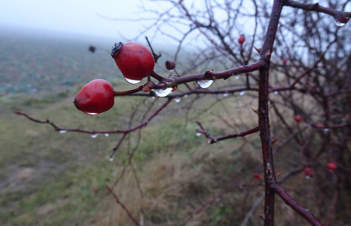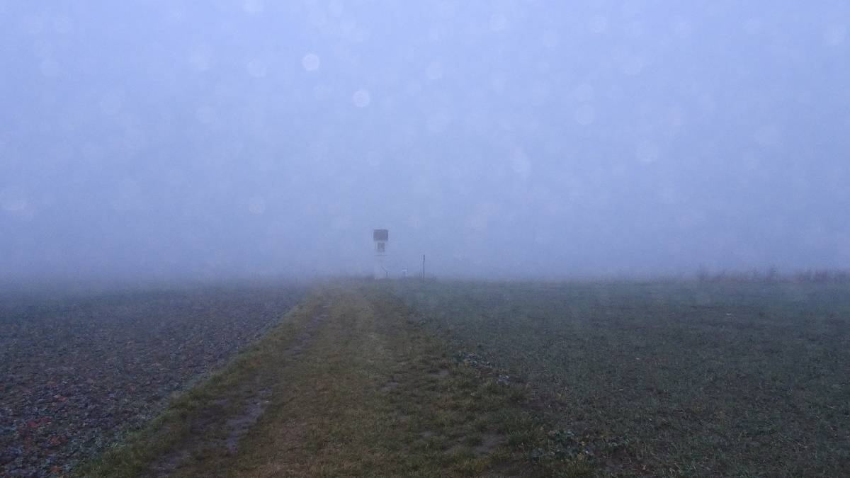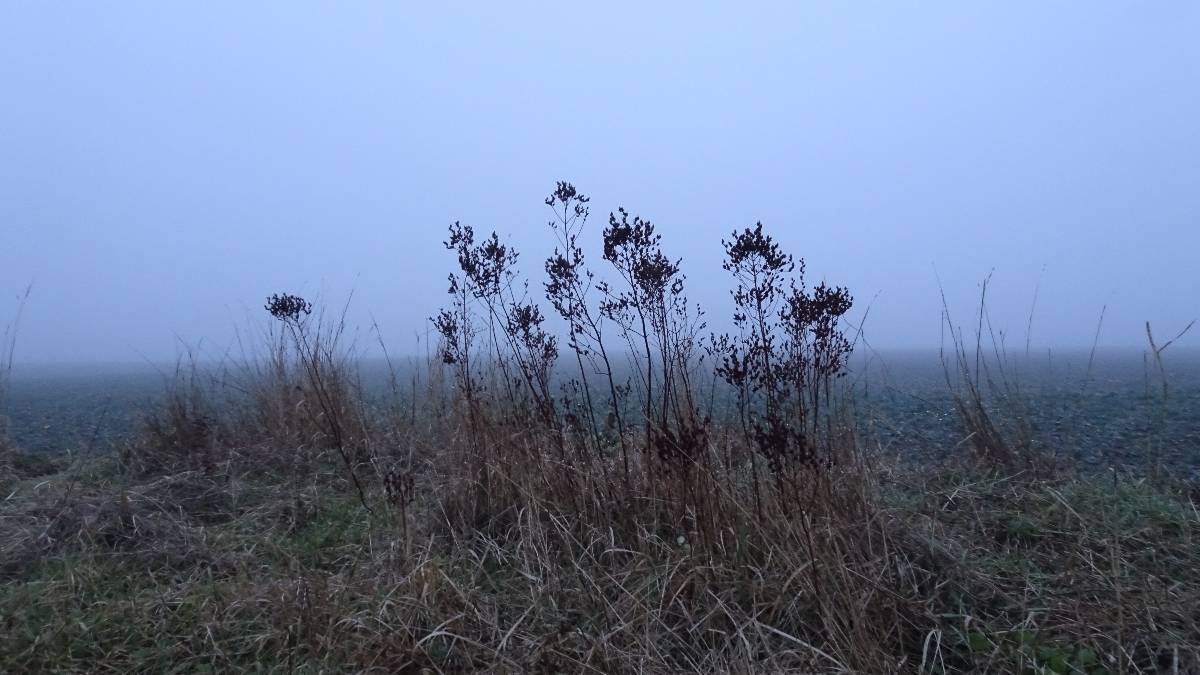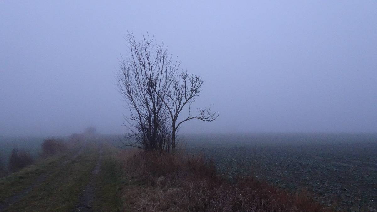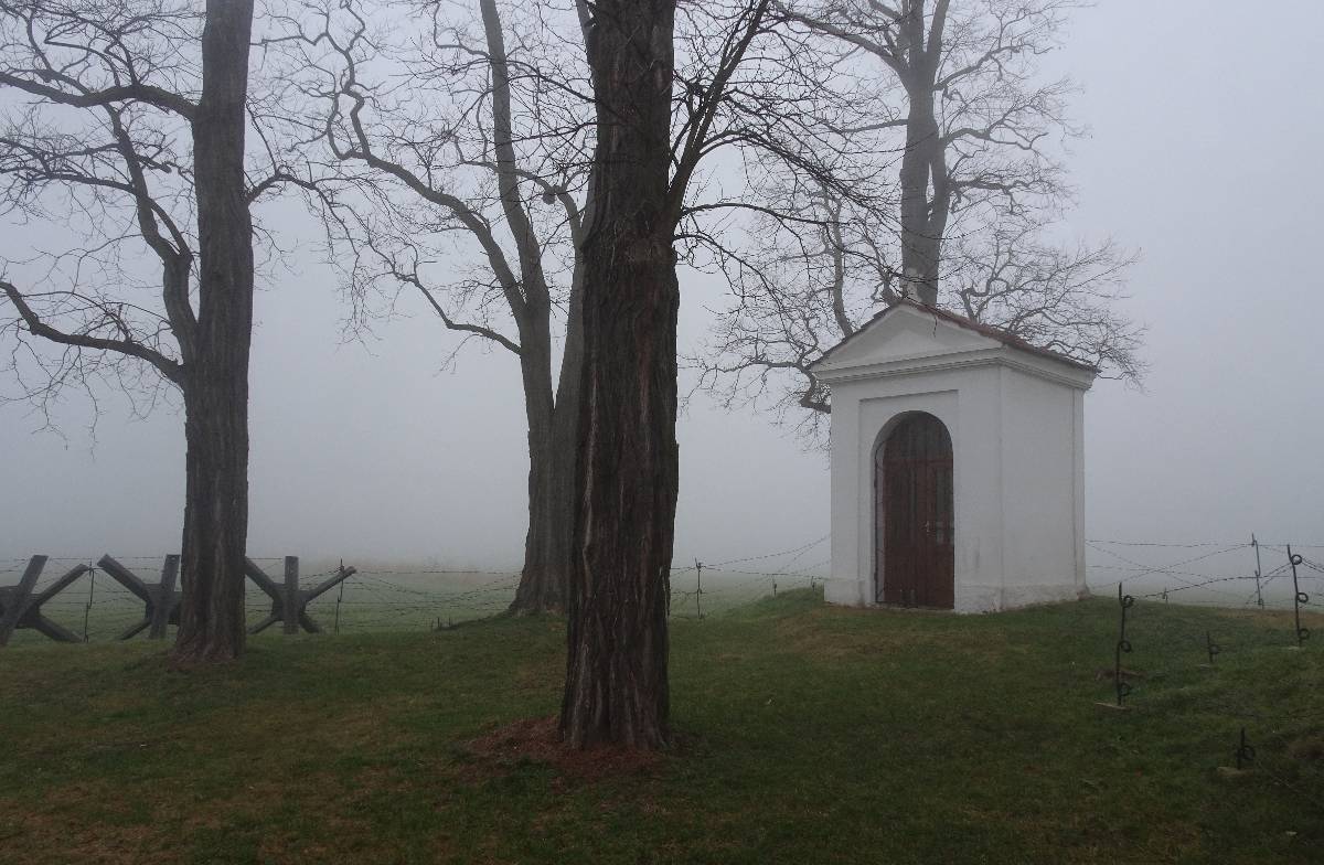 Ale teď už je na čase vyrazit z města kolem kapličky sv. Václava ven na Lužickou cestu a podívat se, jak to v mlze sluší jiné kapličce, kterou můžete znát z mého povídání Mé oblíbené místo od jara do zimy. Jsem v tu chvíli ráda, že nejsem řidič a nemusím sednout za volant, hledat středovou čáru na silnici a jet kamkoliv. Auta se vynořují z mlhy a já míjím zeď, v létě porostlou zeleně, na podzim zbarvenou do červena a nyní jen s několika scvrklými bobulemi čekající na jaro. Brzy jsem za městem a dochází mi, že kdybych měla tvořit mapu, bez váhání bych místa přede mnou označila jako "hic sunt leones". Přede mnou je opravdu jen jedno velké NIC.