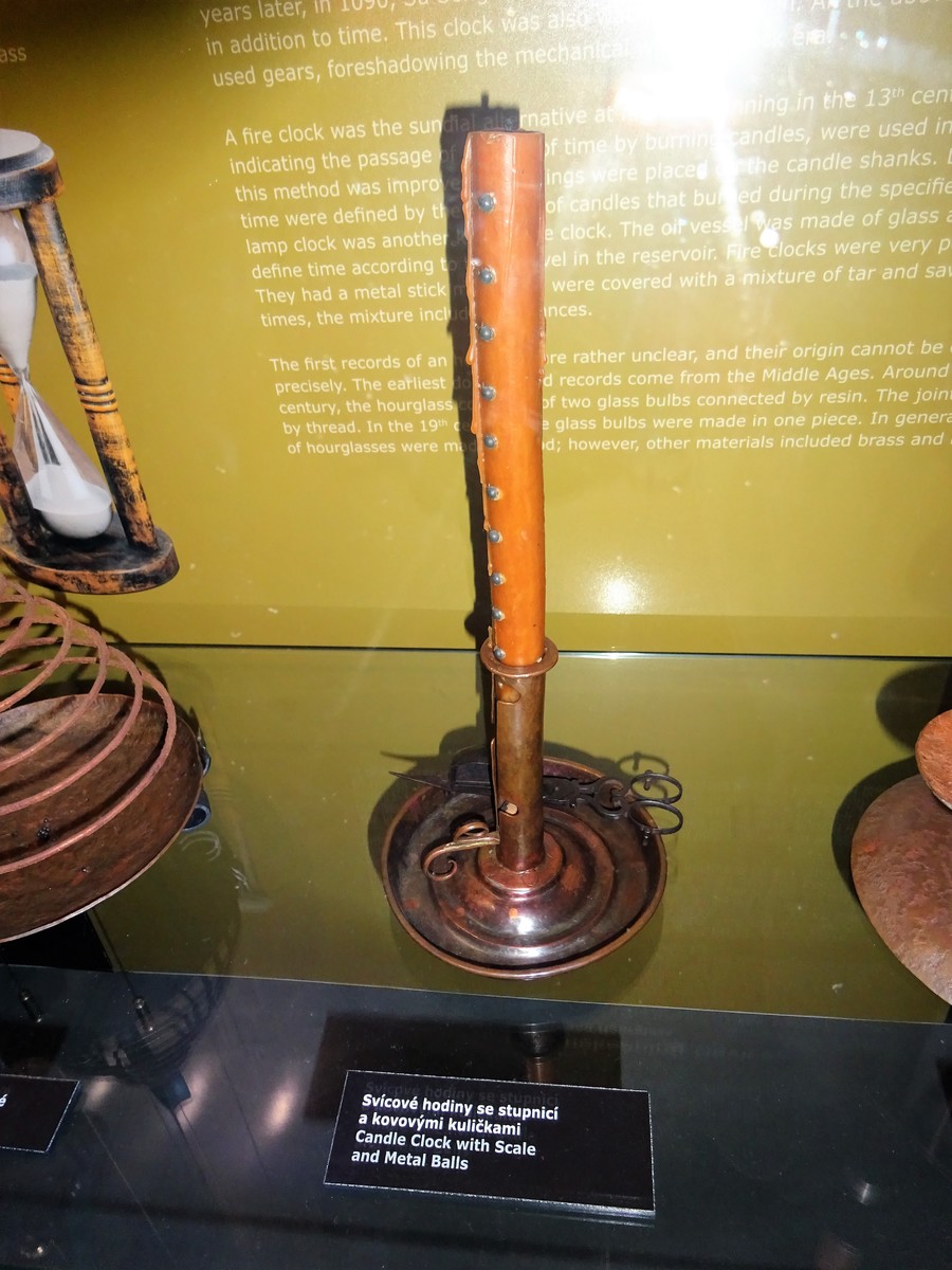 Expozice zachycuje rozvoj českého hodinářství od jeho počátků za vlády Lucemburků. Významné období rozvoje tohoto oboru představovalo 19. století; zasloužil se o něj především Josef Božek (a jeho následovníci). Nádherné jsou sluneční, vodní, ohňové a přesýpací hodiny i kolečkové mechanické hodiny. Je zde ukázána také řada přístrojů sestavených za využití elektřiny, elektroniky i aplikace kvantových fyzikálních jevů při konstrukci hodin – čemuž samozřejmě nerozumím. Zajímavé jsou i ukázky z ručního hodinářského nářadí.