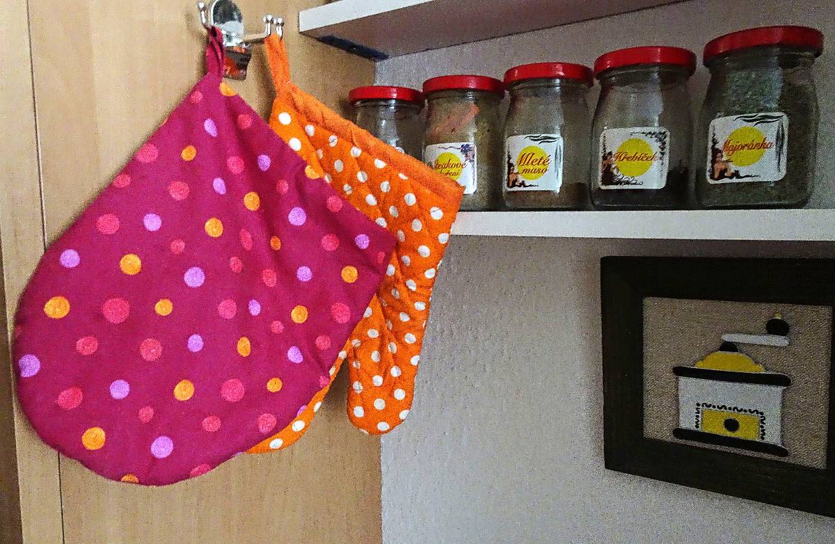 Nedávno mi během pečení najednou odmítla sloužit do té doby poslušná oranžová chňapka s bílými puntíky a odebrala se nepozorovaně neznámo kam. A právě tady a teď se hodí, abych ocenila přátelství a pospolitost i60, protože když jsem se s trápením s uprchlou svěřila plénu zdejšího chatu, na redakční setkání mi Eva Mužíková do Prahy přivezla vlastnoručně ušitou puntíkovanou chňapku. Té starší neposlušnici to sice trvalo, než se odhodlala k návratu, ale přece jen jí asi byla hanba a také ji možná plechy trochu tlačily, protože při jejich vyndávání ze šuplíku pod sporákem se nepříliš ochotně, ale přece pustila a celá placatá z plechového sevření se vrátila na svůj háček.