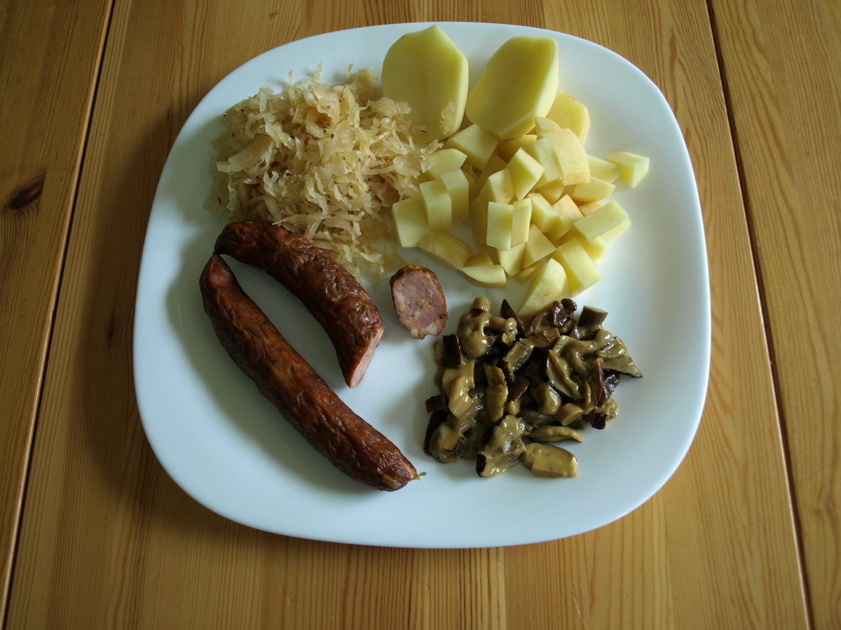 Podle chuti sušené, čerstvé nebo naložené houby, pět větších brambor, kysané zelí dle chuti, 100 g sušených nakrájených švestek zbavených pecek, lžíce sádla, hladká mouka dle potřeby, sůl, jalovec, bobkový list, celý pepř, sladká nebo kysaná smetana. Nejdříve si uděláme jíšku, nejlepší je z vepřového sádla a hladké mouky, po jejím ztmavnutí zásmažku zalijeme vodou, dobře rozmícháme a osolíme, přidáme koření – jalovec, bobkový list a celý pepř a houby – ty sušené předem namočíme. Nejlepší jsou bílé hřiby pravé, na rozdíl od jiných druhů hub polévku nezabarví. Po houbách pro větší sytost do hrnce přidáme na kousky nakrájené brambory, a teprve až po jejich změknutí také nadrobno pokrájené kysané zelí. Tento postup je třeba vždy dodržet, protože brambory vařené společně s kysaným zelím nezměknou. Na závěr do polévky vložíme nakrájené a vypeckované sušené švestky. Ty chuť polévky příjemně doplní a jejich sladkost srazí případnou trpkost zelí. Milovníci masa si polévku mohou vylepšit nakrájenou klobáskou. Na talíři můžeme polévku ještě doplnit lžící kysané nebo sladké smetany. Z uvedených surovin uvaříme čtyři porce.