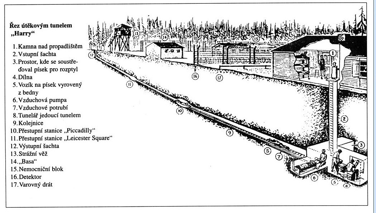 Mezitím raziči kopali vedle tunelů Tom, Dick a George nakonec útěkový tunel Harry. V úzkém tunelu používali vozíky na dřevěných kolejnicích, měli tam i ventilaci a elektrické osvětlení.