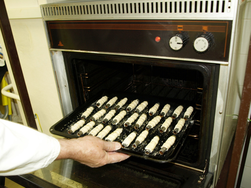 Listové těsto si rozválíme na asi deset centimetrů široké pásy na sílu stébla. Rádýlkem z nich nakrájíme dvoucentimetrové pásky, které navíjíme na malé, tukem lehce potřené kovové trubičky, které lze koupit v prodejnách s domácími potřebami. Tento polotovar potřeme rozšlehaným vejcem a posypeme sezamovým semínkem. Zprudka upečeme v rozpálené troubě na 250 st. C.