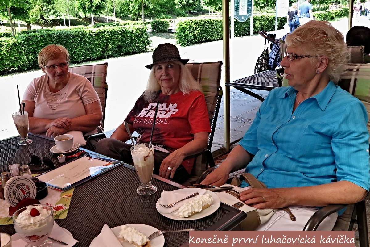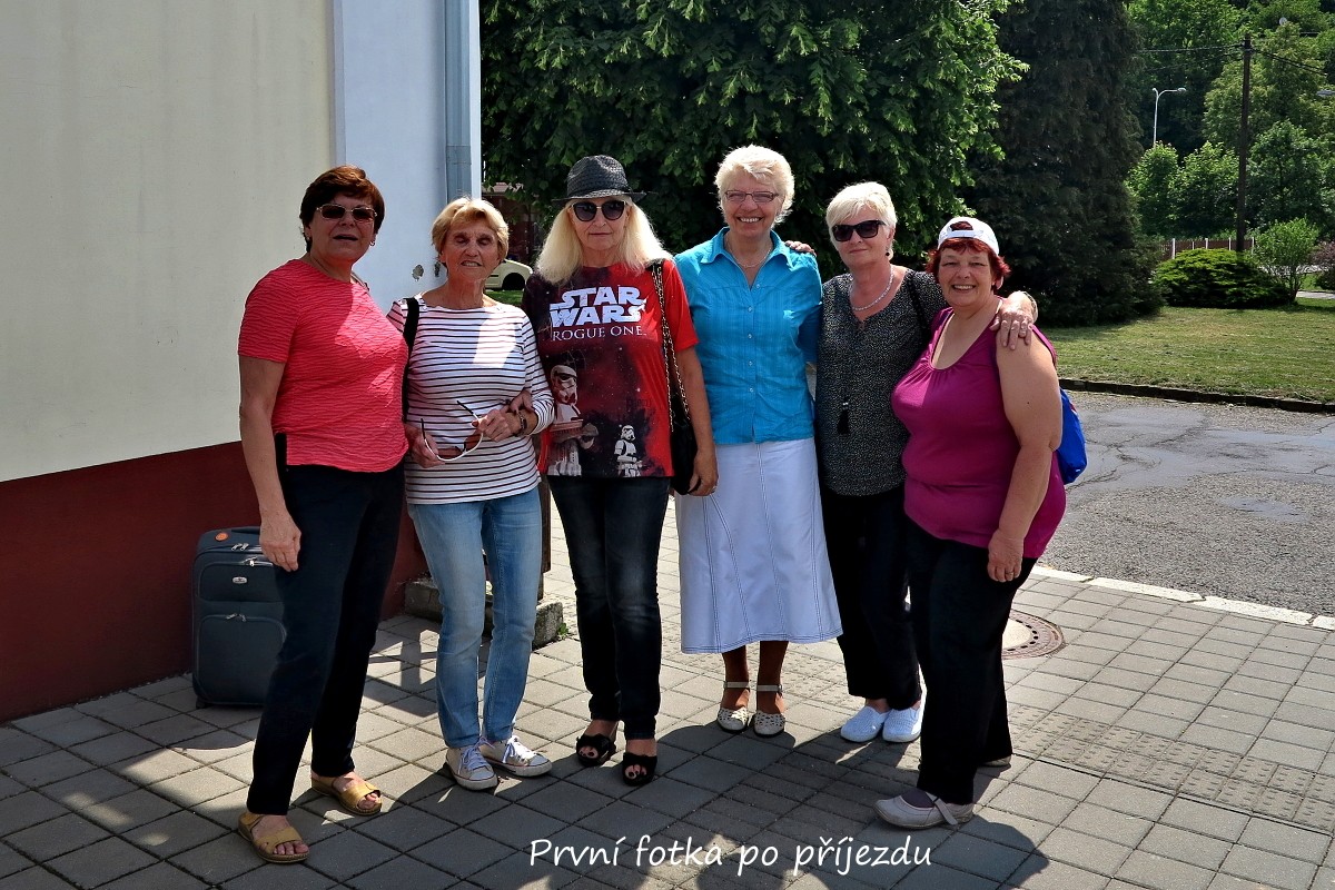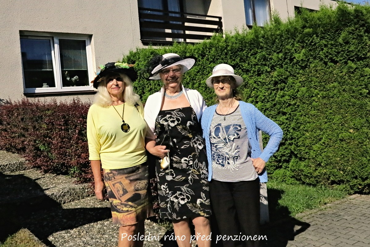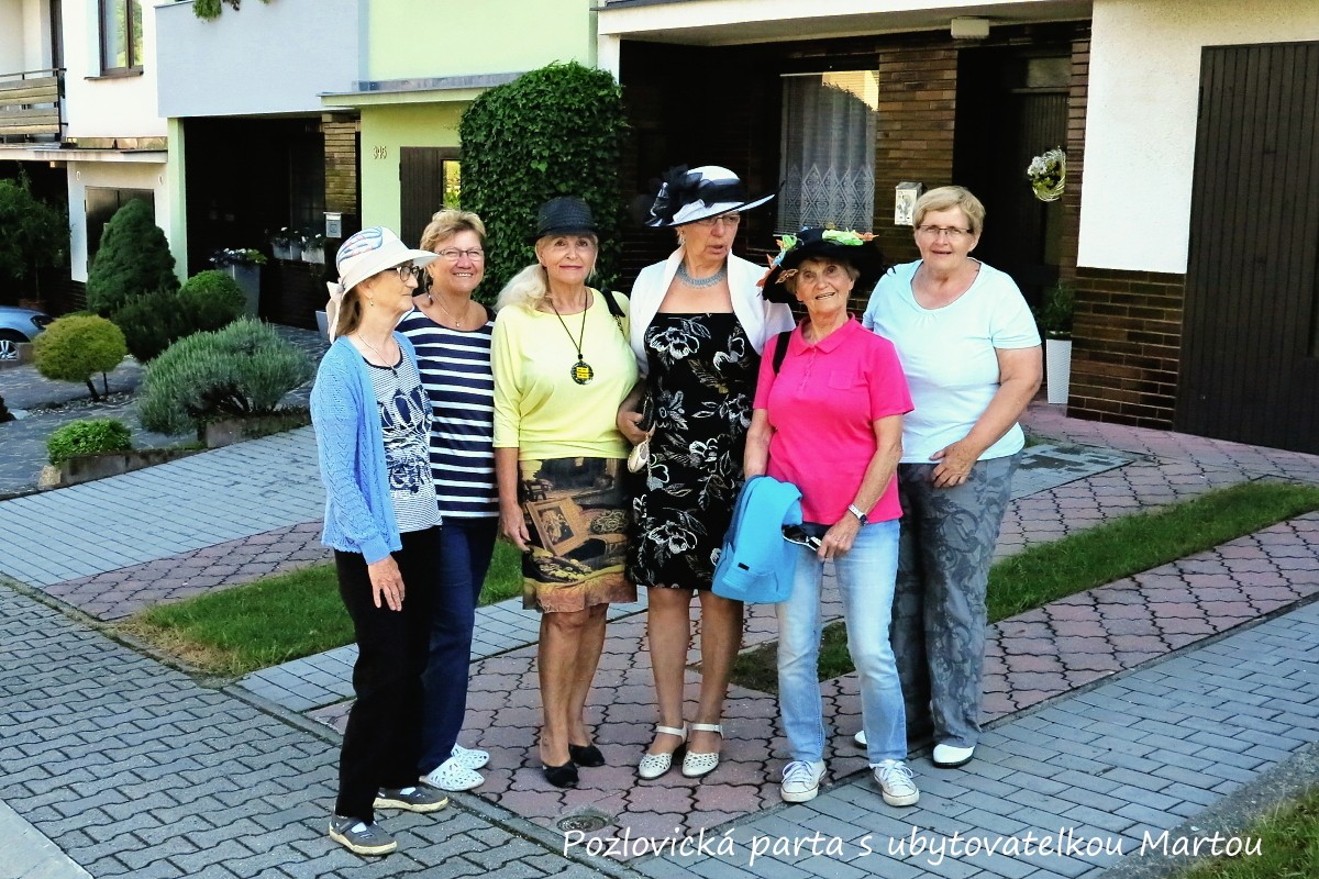 Konečně přišel den "D". Ráno v pátek vstala… a ne jako v té písničce, …prádlo k vodě nachystala, ale spěchala v půl páté k vlaku směr Praha. Po čtyřech přestupech v MB, NY, KO, OL jsme byly konečně Eva, Hela, Zdena, Ája, Olinka a moje maličkost, ve Slováckém expresu. Na nádraží do Luhačovic jsme přijely před půl dvanáctou. Zavazadla jsme si uložily podle místa ubytování k Aničce, nebo k Libušce do auta a vykročily společně, směr Lázeňské náměstí (2.5 km). Ve Společenském domě, pěti bydlícím v penzionu v Pozlovicích, Anička prostřednictvím kamarádky Marty (majitelky penzionu), zajistila obědy na celý víkend, včetně rezervovaného místa na čas, což se později ukázalo, jako jedno velké plus. Po obědě jsme šly na kávičku a po prohlídce blízkého okolí šla Anička zpět na nádraží pro auto, ve kterém měla naše zavazadla. Se Zdenou jsme na odvoz nečekaly a vydaly se do penzionu po svých (2.5 km). Udělaly jsme dobře, neboť hned po příchodu do cíle se spustil prudký déšť. Velice příjemná Marta nás uvítala kávičkou a čerstvým domácím koláčem. O něco později za hustého deště dovezla Anička Áju s Olinkou.