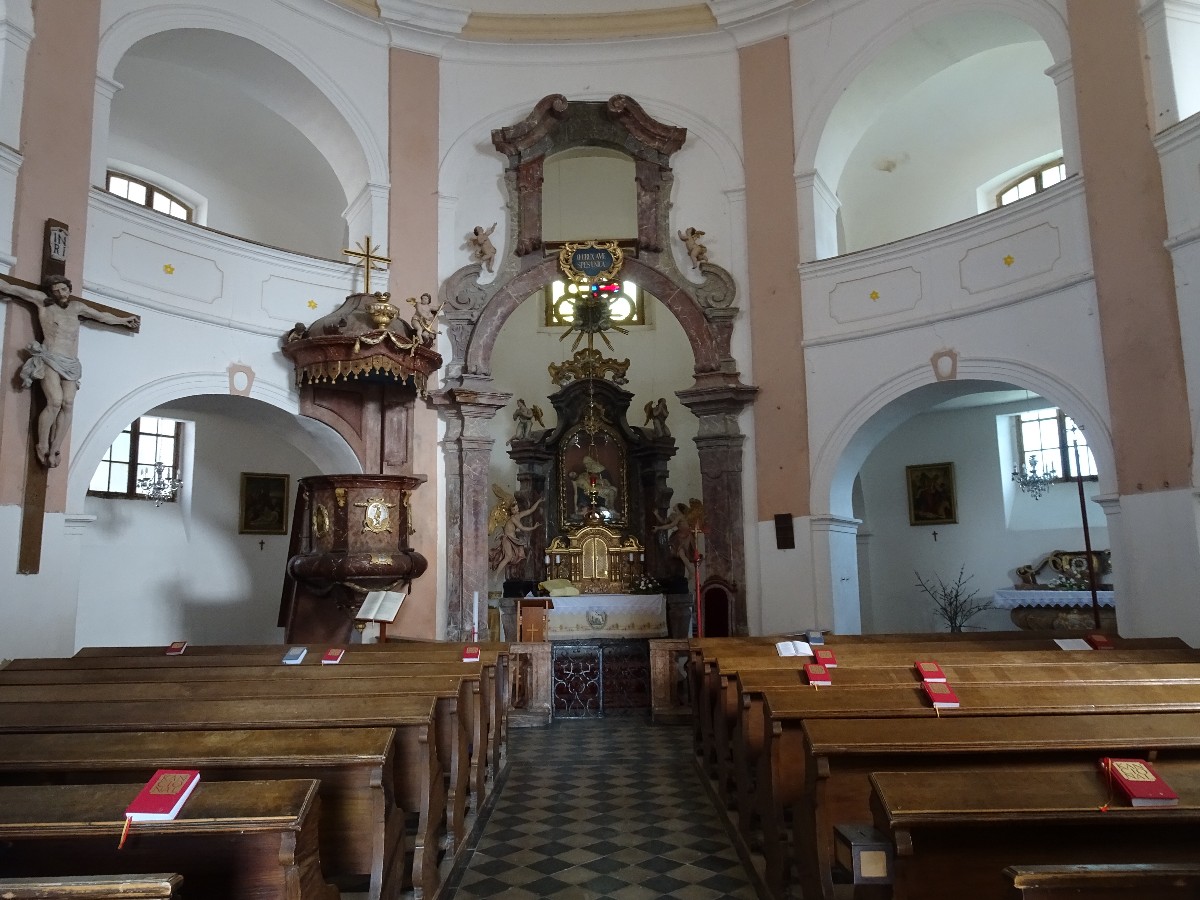 Stavba pozdně barokního kostela nezvykle okrouhlého typu je středobodem hledané obce.  Tato má status městyse, přestože má jen něco přes stovku obyvatel. Na místě hradu, ze kterého do dnešních dnů prakticky nic nezbylo, se na kopci nad obcí tyčí z dálky viditelná zvonice z roku 1699. Malá horská obec je jediným místem u nás s nepřetržitou výrobou keramiky trvající po dobu 600 let. Tato výroba začala postupně zanikat v 19. století, kdy došlo k vyčerpání zásob kvalitního jílu. V mladé Československé republice ještě fungovalo několik hrnčířských dílen, avšak po 2. světové válce již tradice nebyla obnovena. Přesto tu zásluhou několika nadšenců i v dnešní době fungují  malé keramické dílny a pořádají se zde hrnčířské trhy.