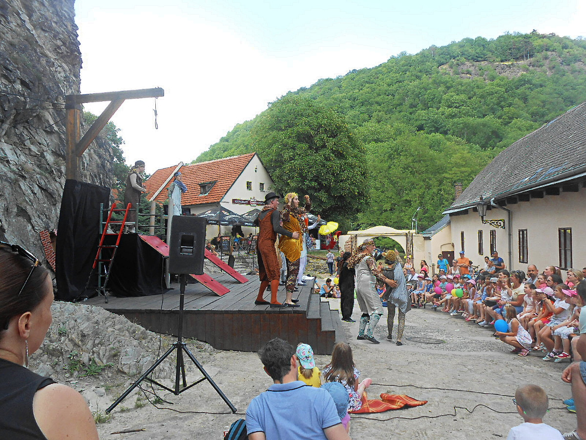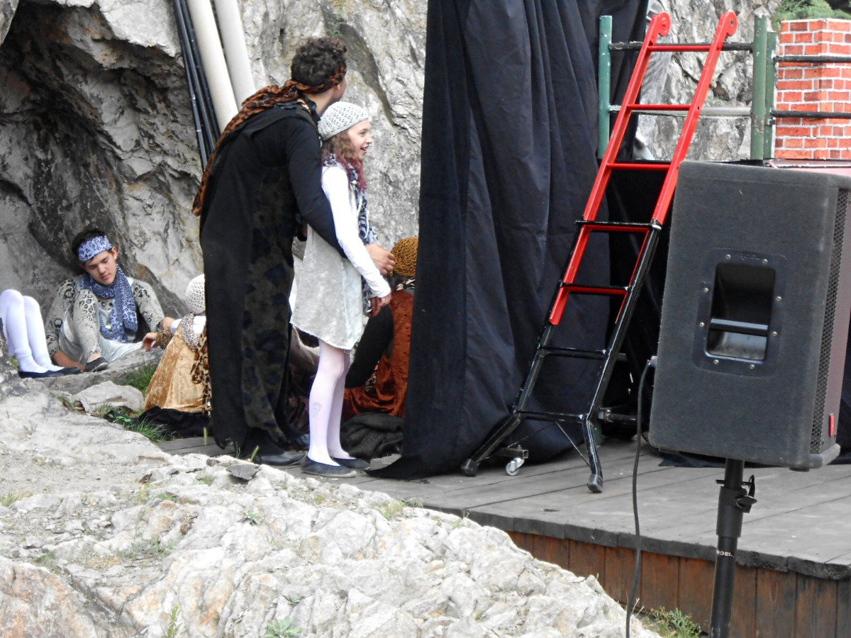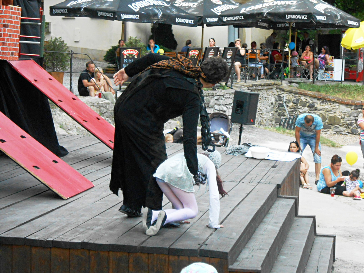 Představení na hradě byla pohádka Kocour Modroočko a bylo to v rámci MDD. Inscenovala ji Mladá scéna, amatérské divadlo, které sídlí v KD Ústí nad Labem a do kterého chodí i naše 10letá vnučka Anička. Sice jsme ji hrát už viděli, když v ní vystupovala poprvé, ale hrad Střekov jsme si nenechali ujít. Dětí se sešlo docela dost a myslím, že se jim pohádka moc líbila. Bylo sice velké horko, herci nebyli nalíčeni, protože by to z nich asi teklo, ale na jejich elánu to rozhodně vidět nebylo.