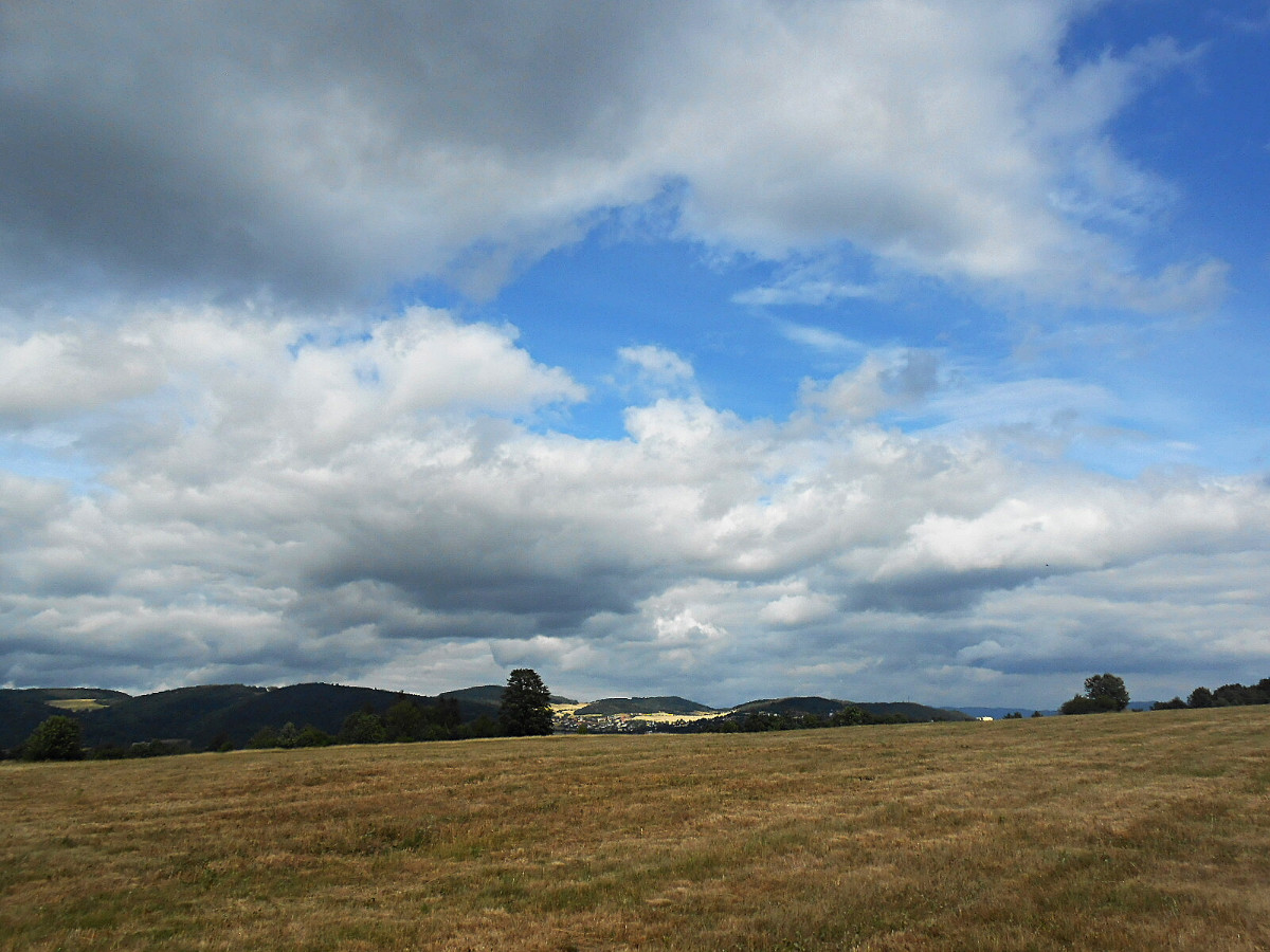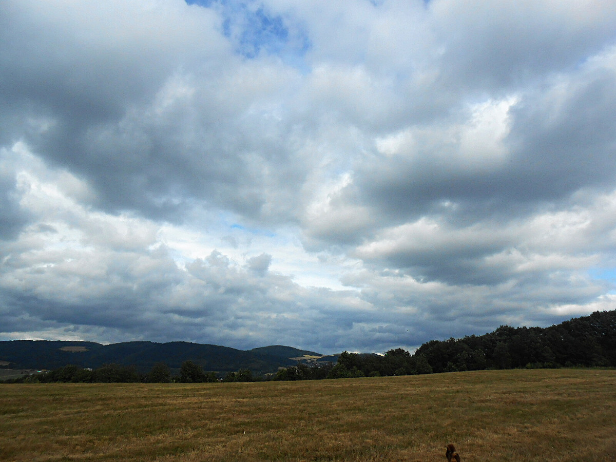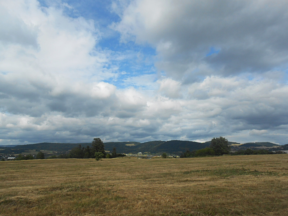 A abych nevybočila z normálu, nafotila jsem svůj oblíbený objekt, a to je nebe nad hlavou. Mraky se kupily, tak jsem vám jich pár vyfotila. No, možná trochu víc. Byla čerstvě posekaná louka a vzhledem k tomu, že tady dost dlouho nepršelo, tráva vypadá spíš jako na podzim, ale je neděle 24.6.2018, fakt.
