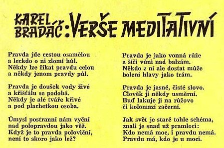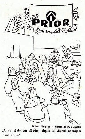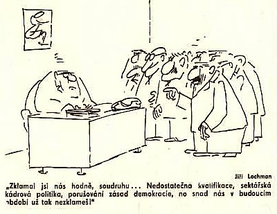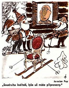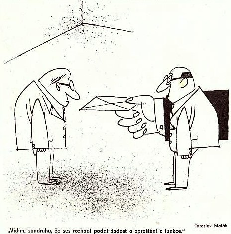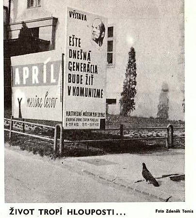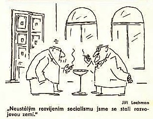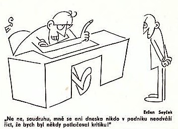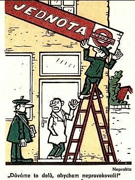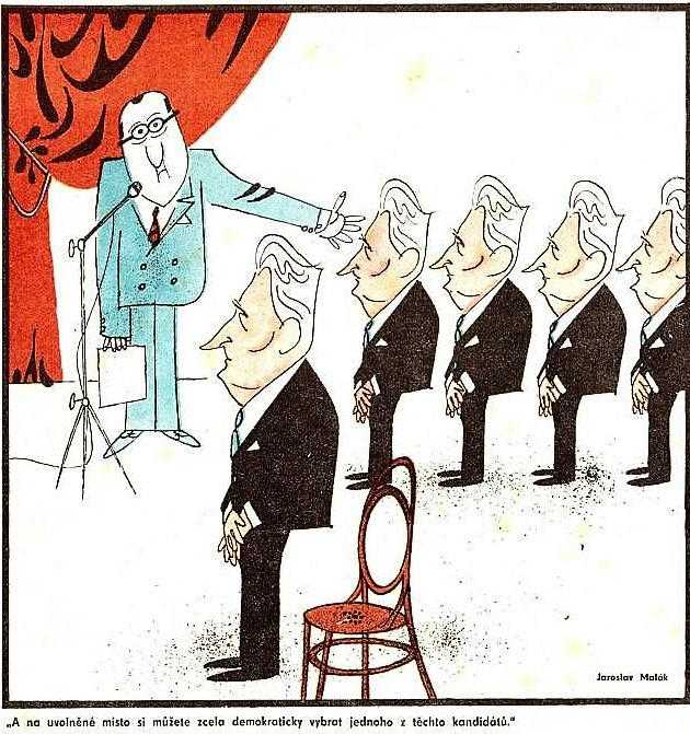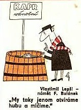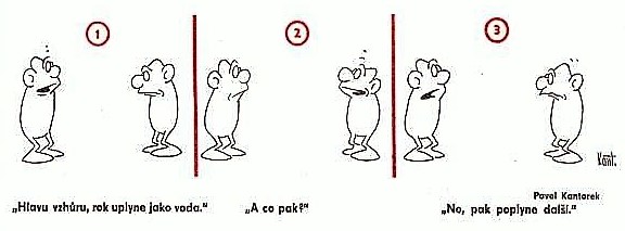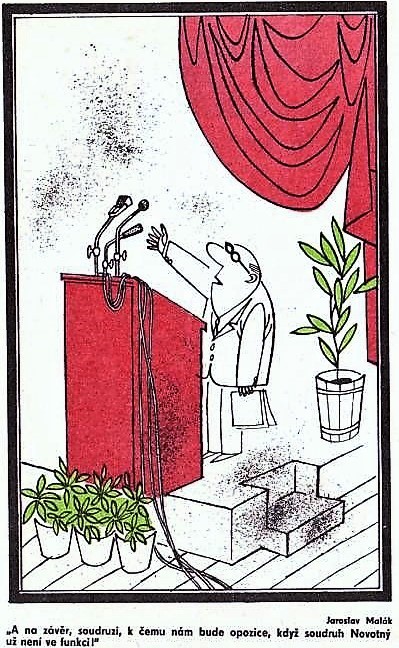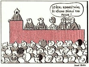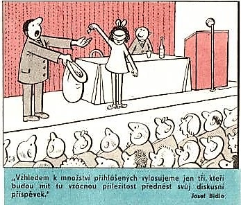 1968/29 „Byla jedna schůze JZD. Předseda zahajuje. „Soudruzi, vítám vás na dnešní schůzi. Na pořadu máme dva body. První bod: zastřešení kravína. Druhý bod: přechod od socialismu ke komunismu. Soudruzi! Protože nemáme hřebíky, přecházíme ihned k druhému bodu.“