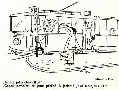 1968/45 „Večerní Praha (23. 10.): Když přejížděl křižovatku ulic Ječné se Žitnou, jistou maličkost přehlédl. / Nepatrnou: obě jsou ulice rovnoběžné.“