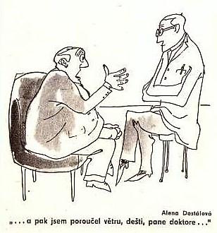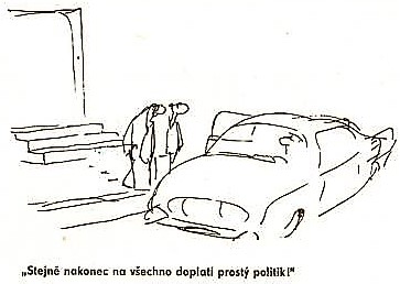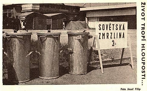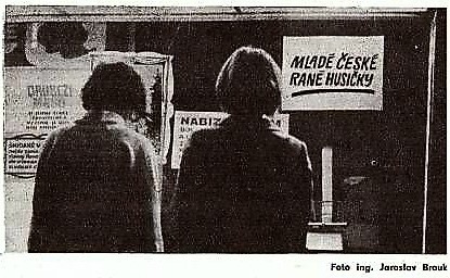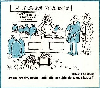 1968/11 „Dlouhá fronta před stánkem se zeleninou. Netrpělivě přešlapující pán hubuje. – Kruci, takových let po válce … Najednou se ohlédne a vidí příslušníka SNB. Dodá: - a furt prší a furt prší.“