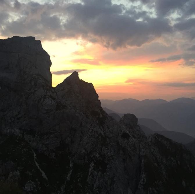 Přesně taková je fotka ze stoupání na Mangartské sedlo (tentokrát večer, ne ráno), pořízená Leošem. Snad bude dobře vidět, protože autorské fotky Leoše musí mít přednost před ostatními. Minimálně proto, že to fotil kvůli nám.