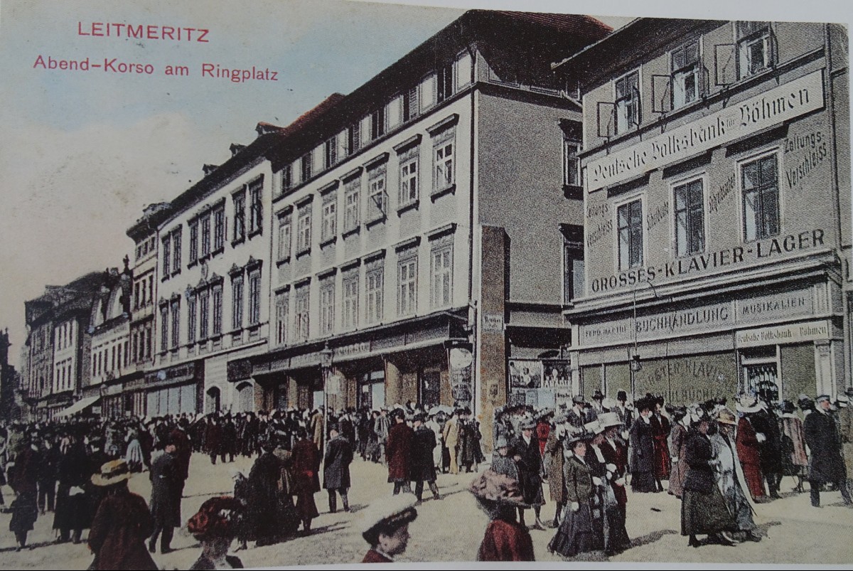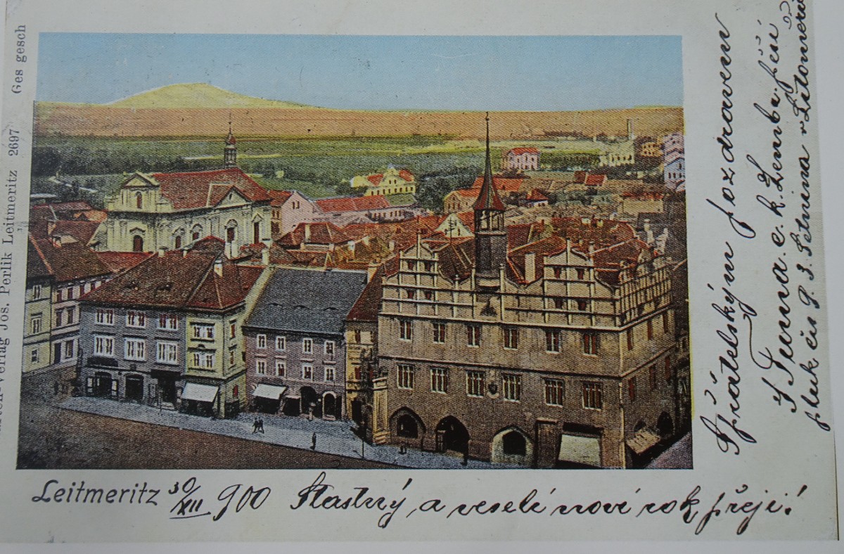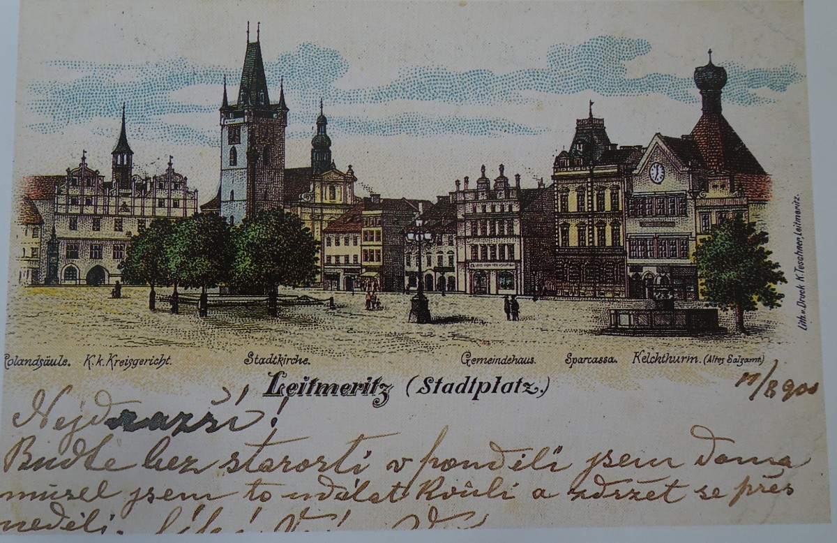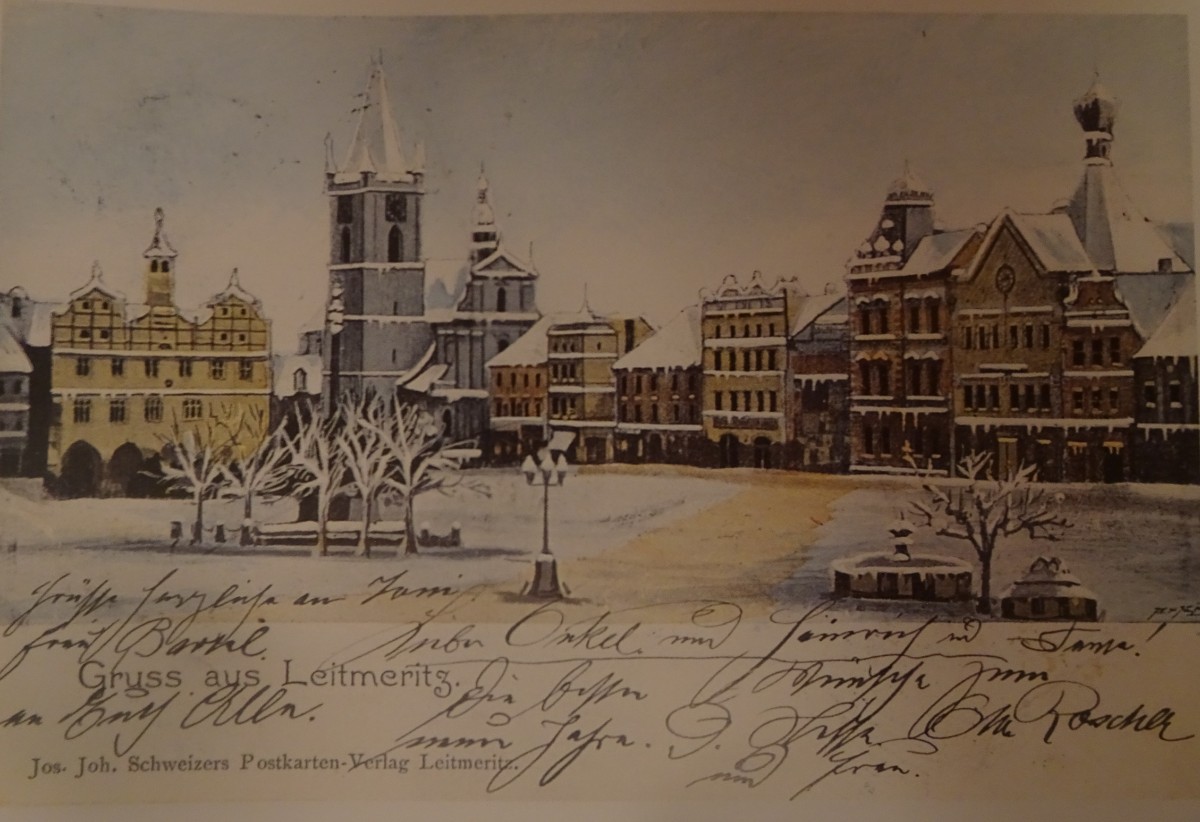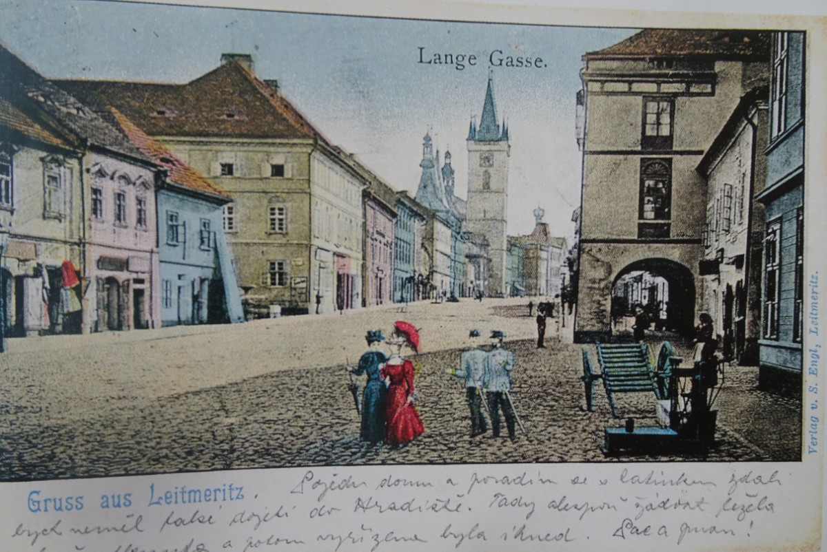 Pokusila jsem se vrátit na chvíli do minulosti, do doby, kdy se Litoměřice nazývaly Leitmeritz, a hledala jsem místa, odkud byly různé objekty zachyceny. Většina pohlednic je ze začátku 20. století a nápisy a vývěsní štíty tehdy byly psány německy. Litoměřice totiž byly součástí území tzv. Sudet a většina obyvatelstva se hlásila k německé národnosti. Ta doba je však od konce 2. světové války naštěstí minulostí.