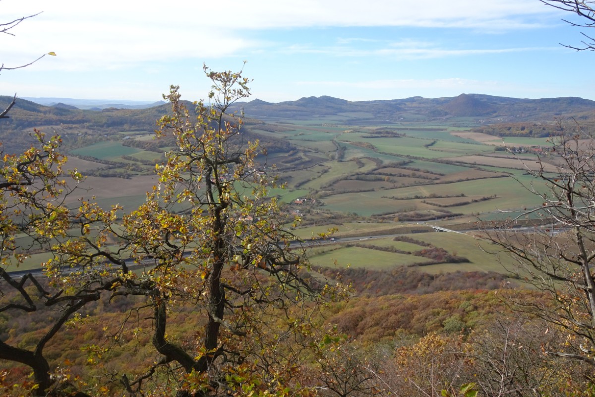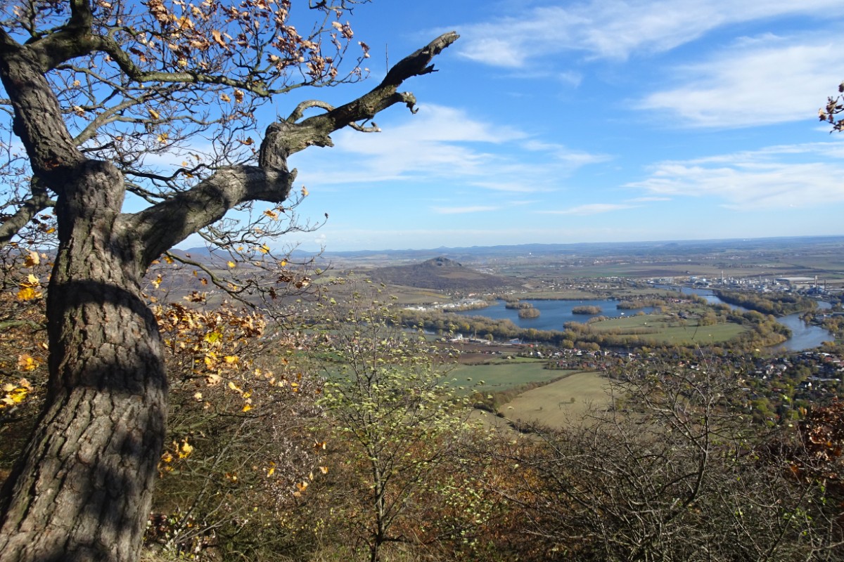 Nesmím však zapomenout ještě na odbočku na Kybičku. Tam sice není žádná vyhlídková terasa ani kruhový výhled, ale Panenské kameny a pokroucené kmeny starých stromů zavánějí romantikou a pohled lovosickým směrem do daleké krajiny za těch pár kroků stojí.