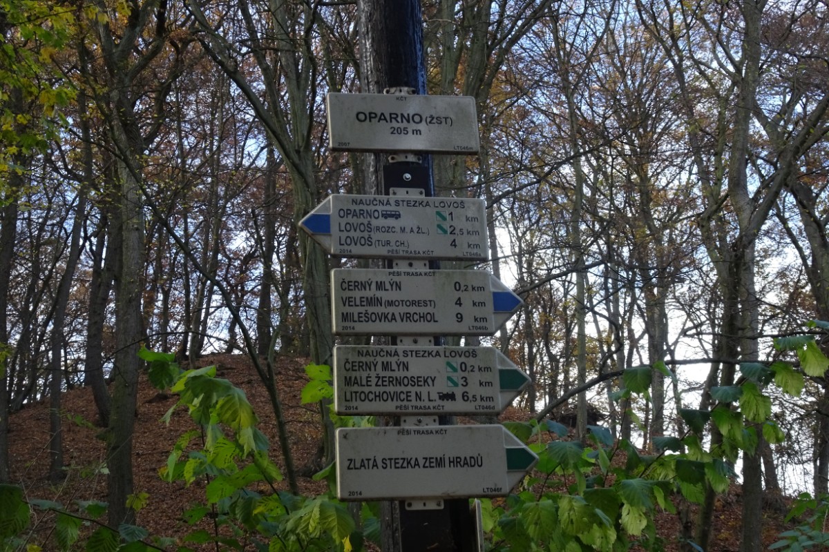 Sluníčko stále prosvětluje podzimní les a vesele si vykračuji po žluté značce. Ouha! Ten les se mi zdá nějaký jiný a už bych snad měla jít dolů po Císařských schodech! Trochu s úlekem a následným smíchem nad mým orientačním nesmyslem mi malé šedé buňky oznámily, že sice jdu správně po žluté, ale ne tam, odkud jsem přišla, ale docela na druhou stranu. To je někam za Lovoš k dálnici. Tak tam opravdu nechci. Co naplat, musím se vrátit. Nechce se mi však zpátky k vrcholu, tak na křižovatce značek uhýbám na modrou, která určitě vede dolů do Opárenského údolí a uvidím. Viděla jsem. Modrá mě dovedla až do Opárna. Byla jsem sice o dost dál, než jsem chtěla, ale mělo to svou výhodu. Milešovka a Kletečná přímo přede mnou měly z tohoto pohledu rázem docela jiné parametry. Nezbylo mi než projít celé Opárno a kolem půvabného Černodolského mlýna se po zelené vydat Opárenským údolím zpátky. Cesta podle potoka, tentokrát po jeho proudu,  není vůbec náročná a když jsem došla k místu, kde se zelená spojila se žlutou, po které jsem měla původně přijít, zbýval už jen kousek zpátky k vlaku do Malých Žernosek. V nohách mám asi 14 km a hlavu plnou krásných pocitů z naší nádherné krajiny, kterou se vám ráda snažím představovat.