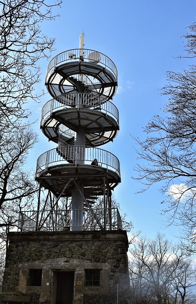 Zaparkovali jsme a vydali se turistickou cestou. Kopec není náročný, na vrcholku se tyčí železná rozhledna, která v roce 1973 nahradila starší dřevěnou rozhlednu z roku 1927.