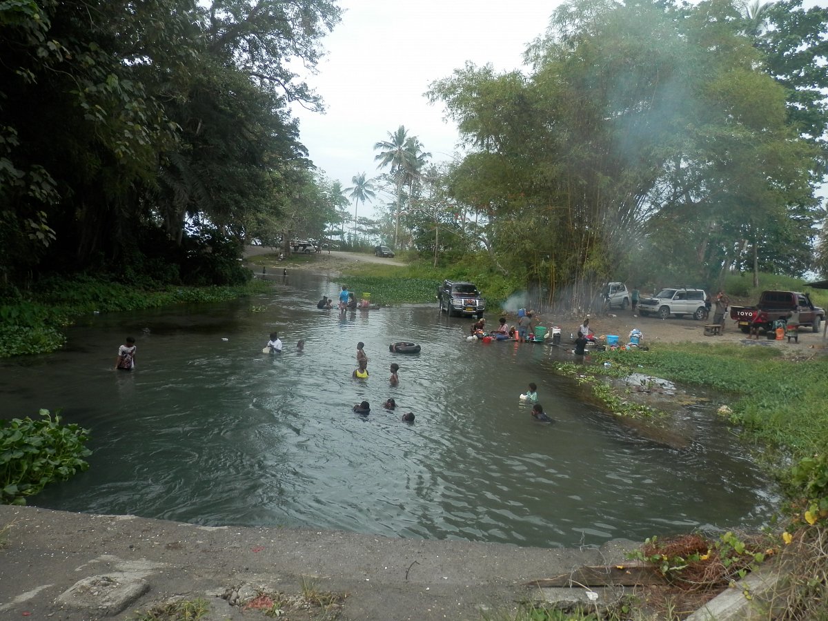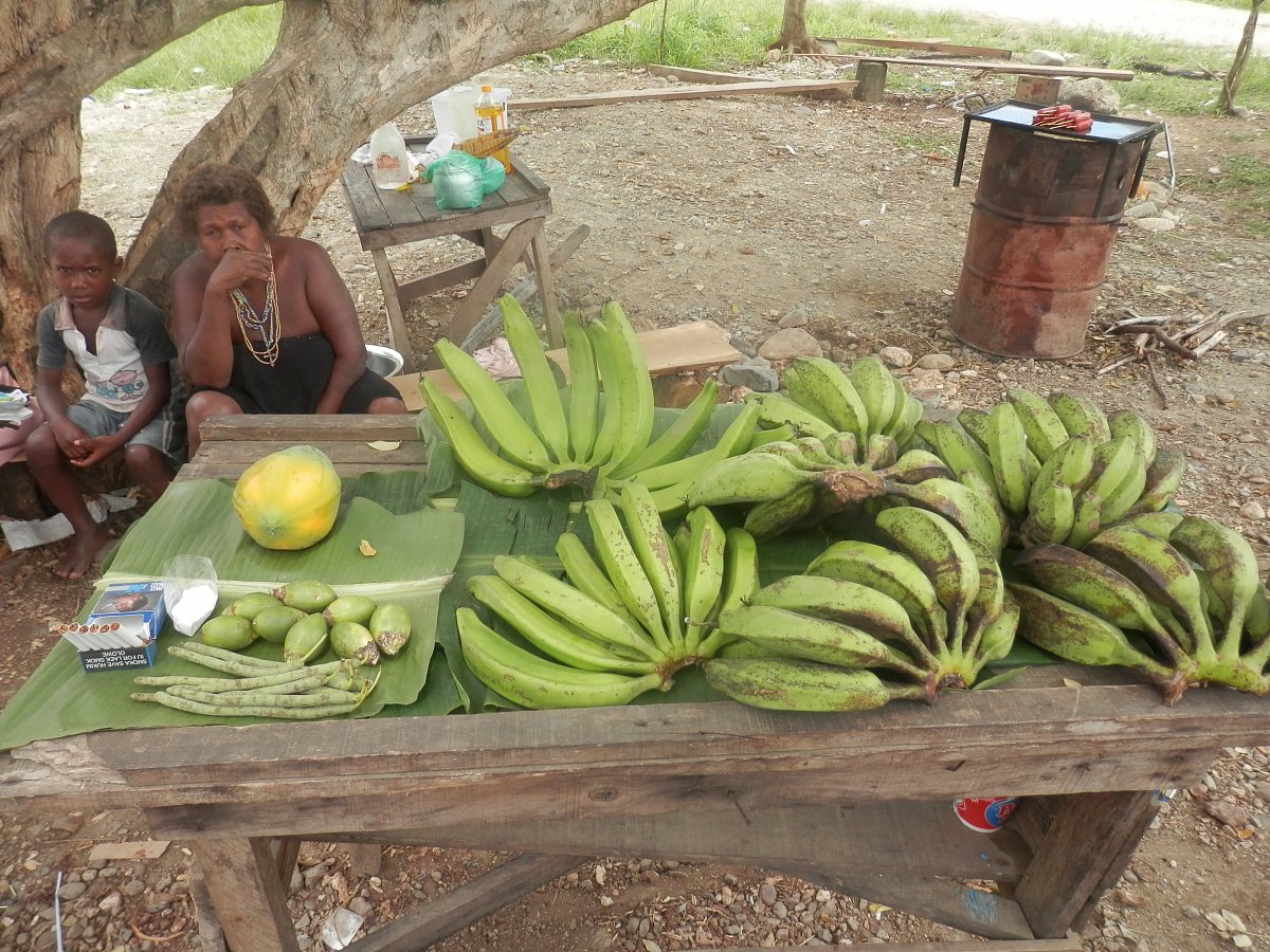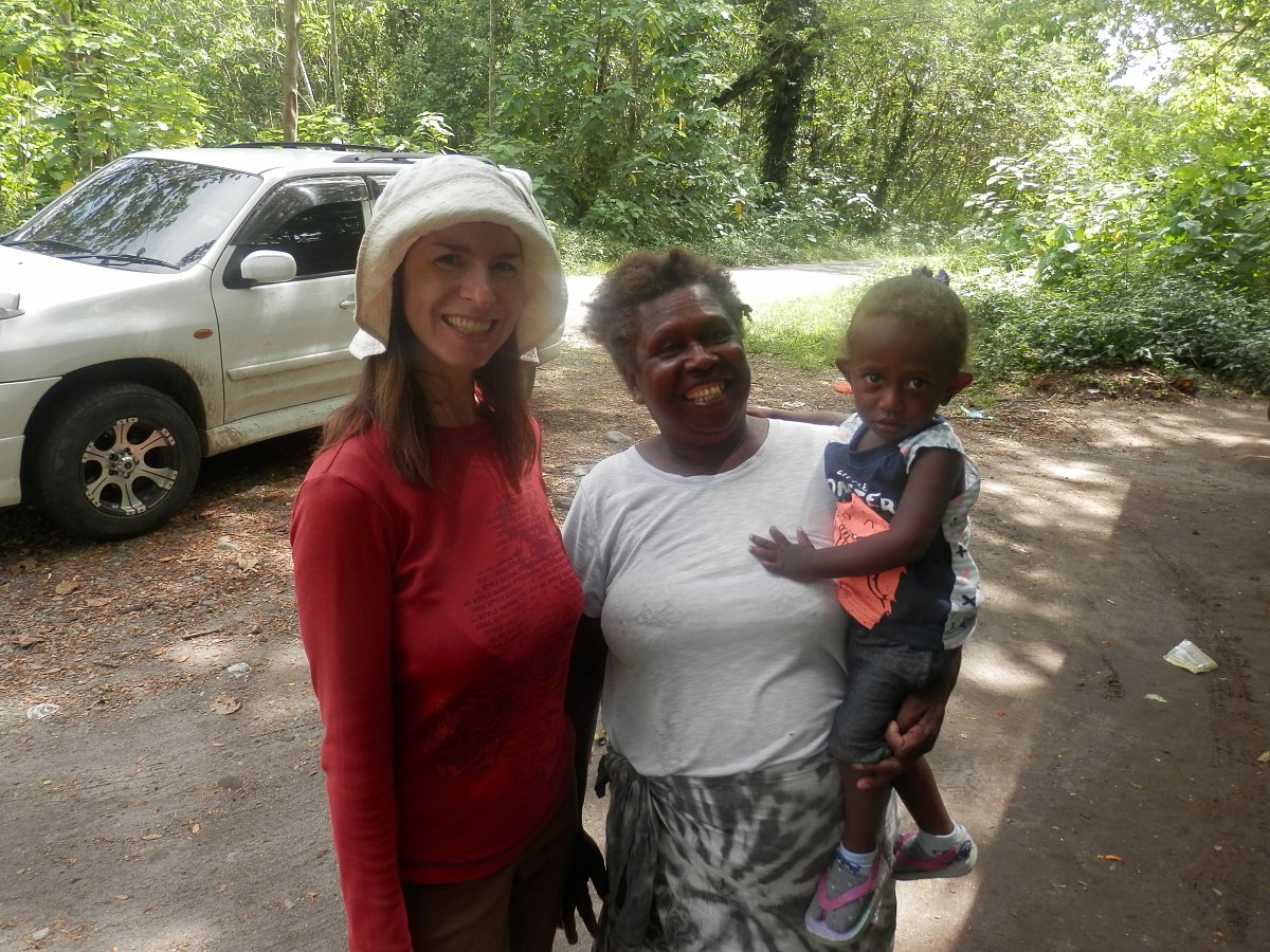 Náš průzkum ostrova byl omezen místem, kde končila silnice. Na západ od Honiary připomínala krajina botanickou zahradu. Bujná tropická zeleň, místy otevřený prostor skýtající pohled na hory, vodní toky a mezi tím vesničky. Někde silnice lemuje přímo pobřeží, někde se od něj vzdaluje. Čím dále od hlavního města, tím jsou vesnice čistější a upravenější. Podle našeho řidiče je to díky tomu, že vzdálenější vesnice si udržely tradiční sociální strukturu, zatímco ve městě převažuje individualismus a nikdo se nestará o své okolí. Lidé, které potkáváme cestou, na nás mávají. Jako všichni Melanézané mají tmavou pleť, kudrnaté vlasy a muži často vousy. Vypadají dost divoce, ale jsou milí a přátelští. Není běžné zde potkávat cizince. Zastavujeme u stánku s ovocem a zeleninou, abychom si koupili banány. Usměvavá majitelka nám hrdě ukazuje výpěstky ze své zahrady a na rozloučenou se nechá vyfotografovat i s vnučkou.